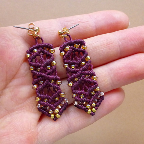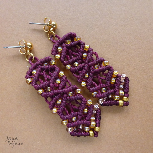 mc117 17/08/2014VENDIDOS ( Prodáno)Jana Bijoux Brincos de titânio com acabamento dourado, com tarracha e macramé cor bordo- vinho, comprimento 5,2 cm. R$ 18,00