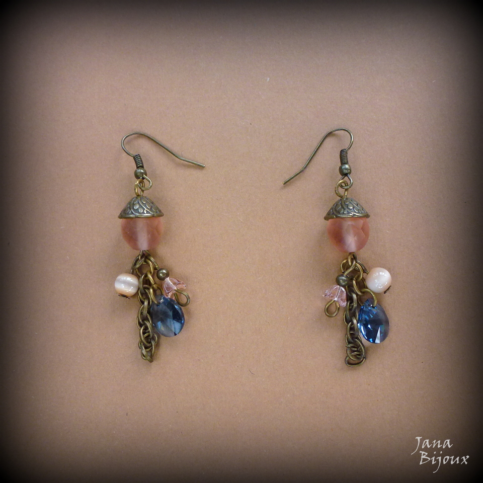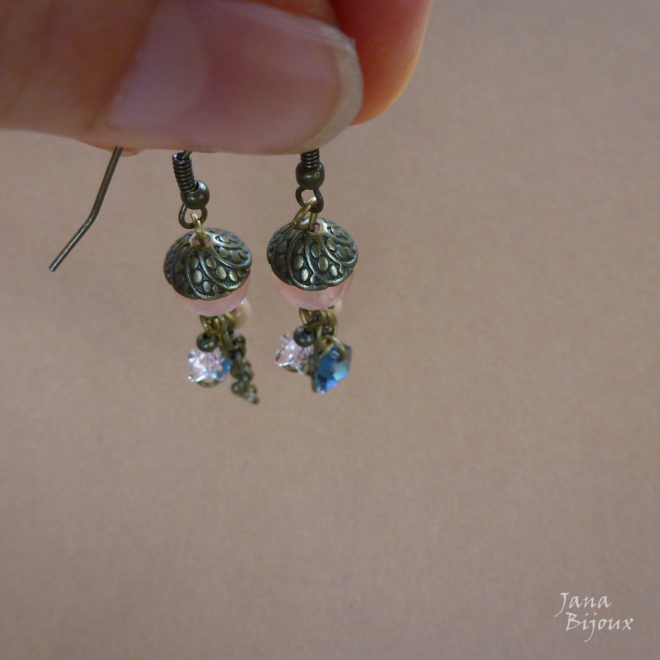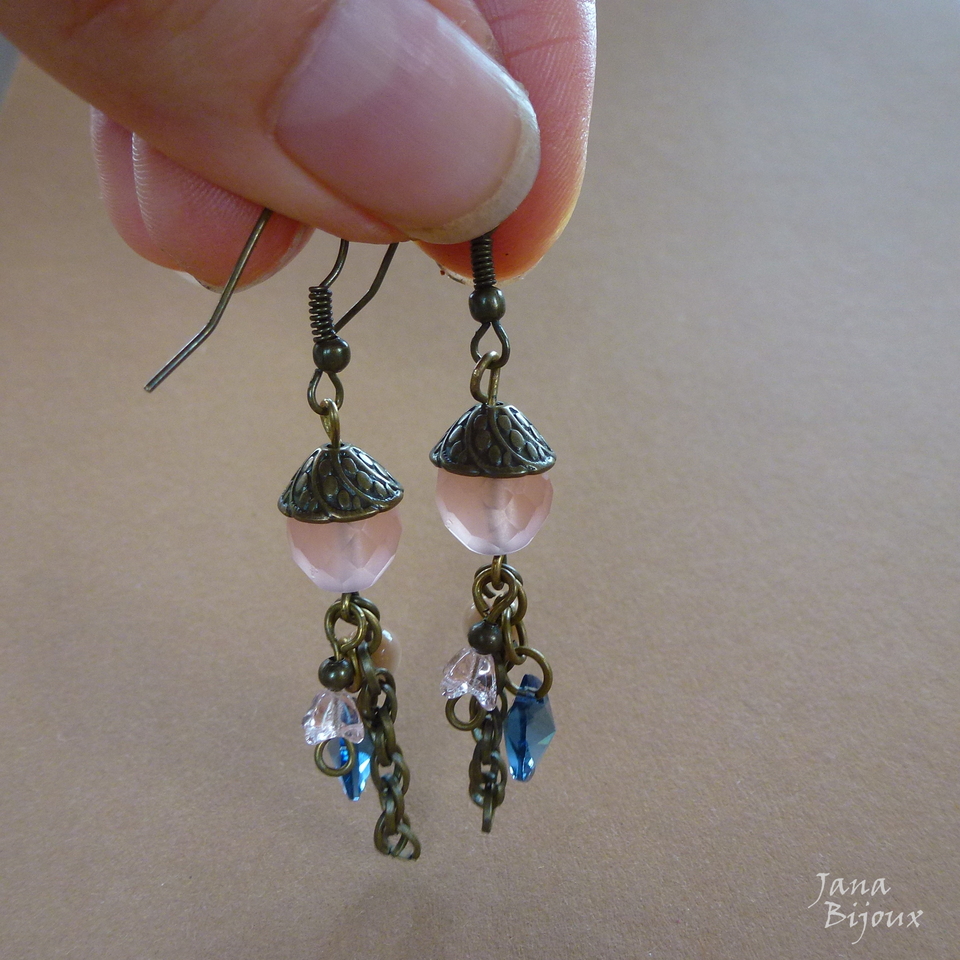 mc164 13/12/2015VENDIDOS ( Prodáno)Jana Bijoux Brincos delicados, compridos 6 cm em ouro velho, fecho sem niquel, com vidro, flores de vidro rosa claro e gotas azuis de cristal Swarovski R$ 18,00