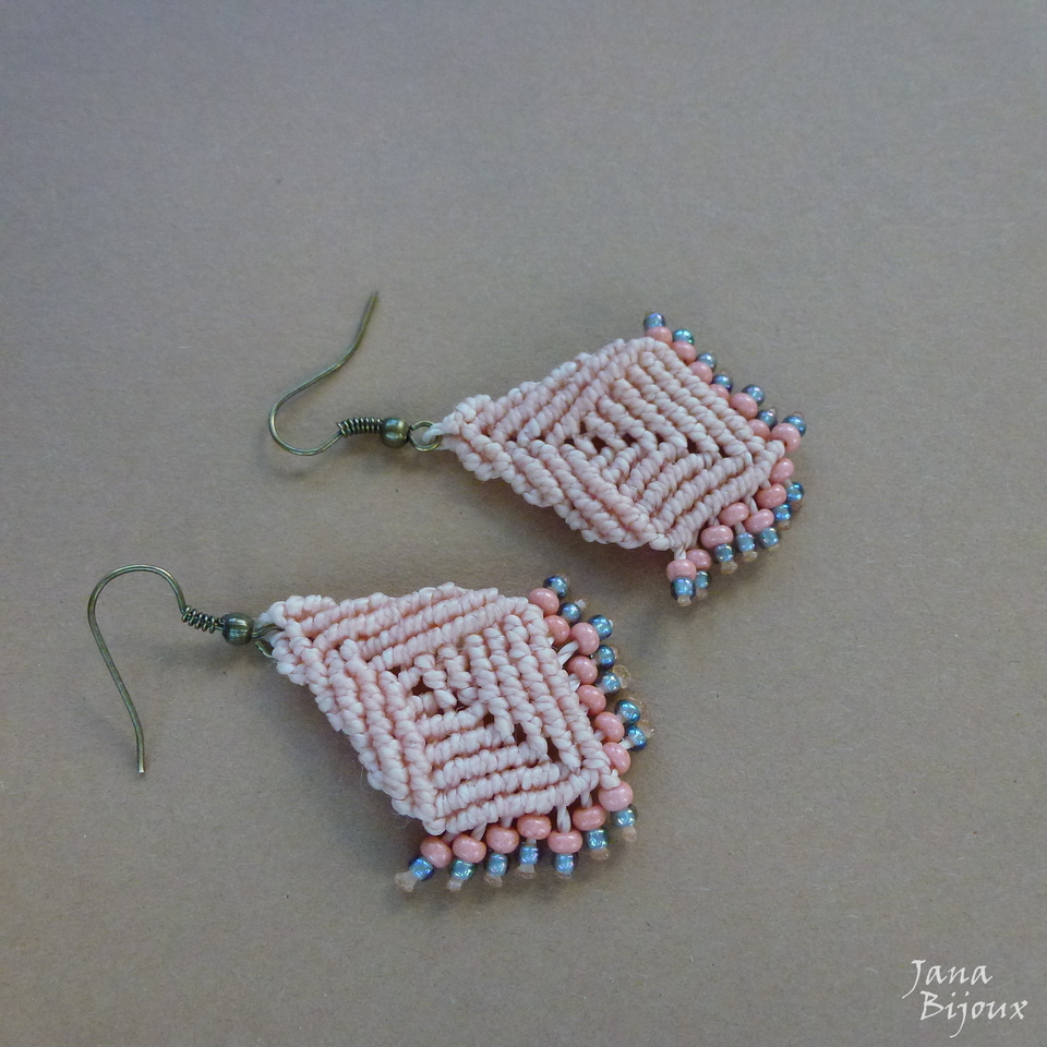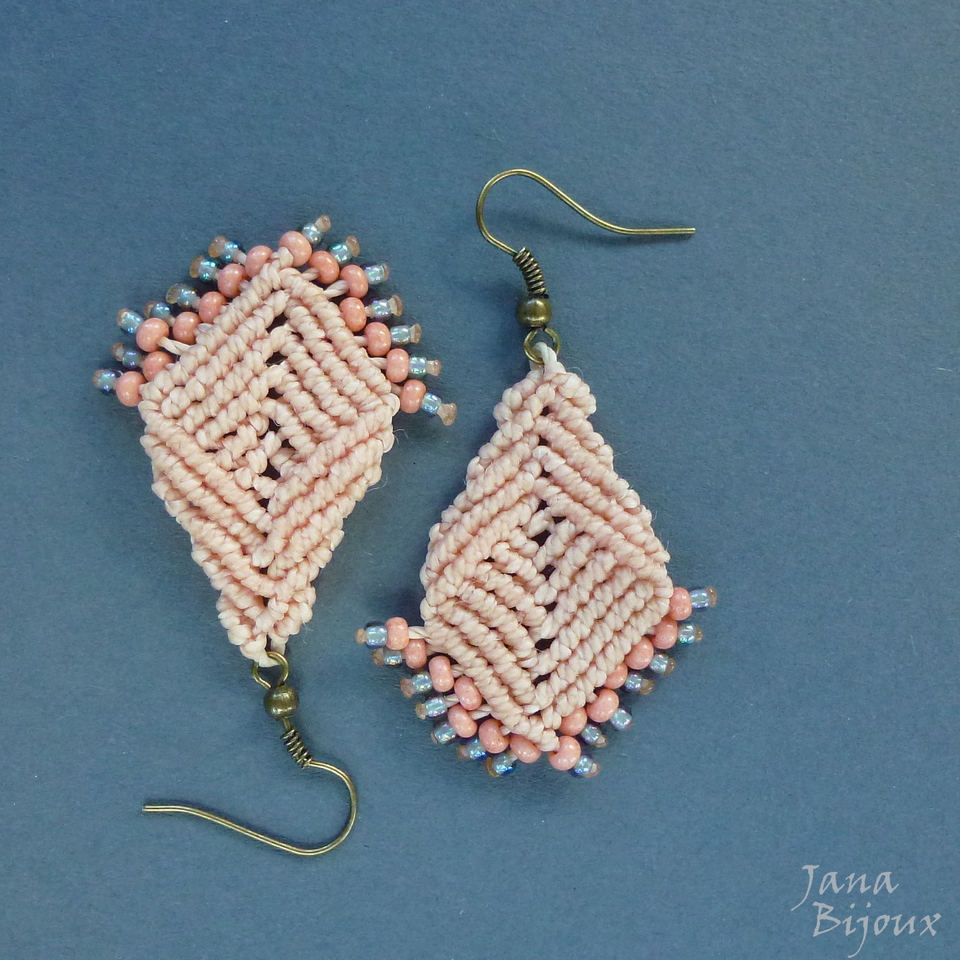 Brincos de macramé, super leves de comprimento 5,5 cm, cor pêssego claro com acabamento em ouro velho sem niquel de R$ 18,00 por R$ 12,00