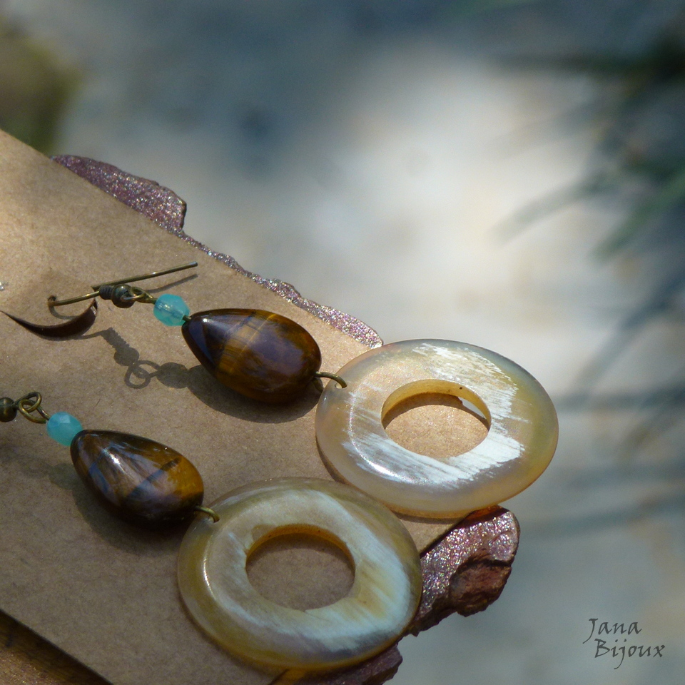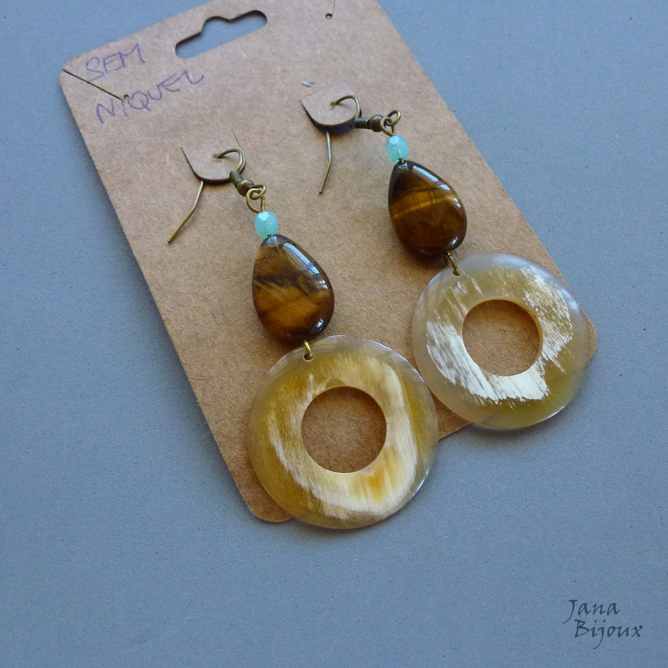 Brincão leve, com argolas de chifre, gotas de pedras naturais olho-de-tigre e vidro. Anzois sem niquel, comprimento 7,2 cm R$ 28,00