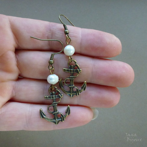 Brincos com pérola rústicas de água doce e ancoras de ouro velho. Fechos sem niquel, comprimento 5 cm R$ 16,00