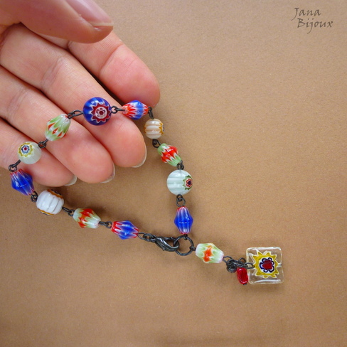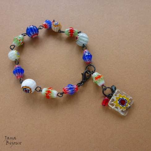 n101 01/11/2014VENDIDOS ( Prodáno)Jana Bijoux Pulseira de millefiori, componentes pretos de zinco preto, comprimento opcional de 19 cm ou de 21 cm R$ 25,00