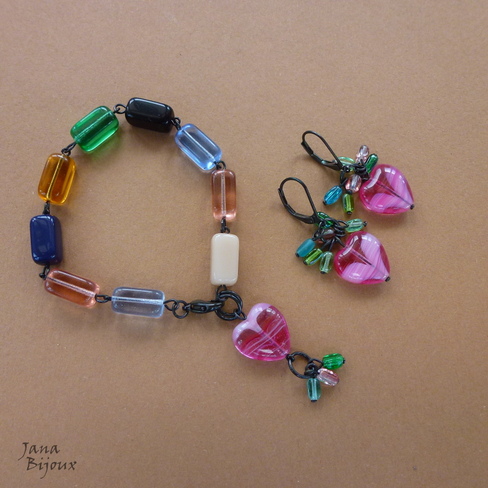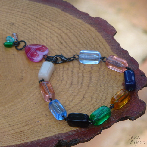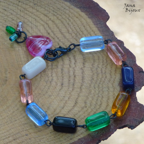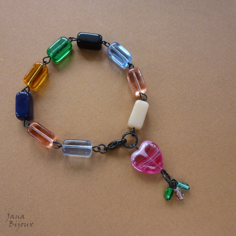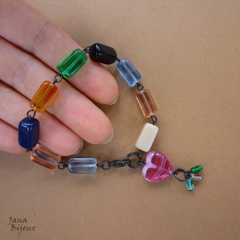 Pulseira de vidro grosso, componentes de zinco preto, comprimento 19,5 cm ou 21,5 cm + penduricalho com coração e canutilhos de cristais pequenos. Possível com estes brincos como conjunto. R$ 26,00