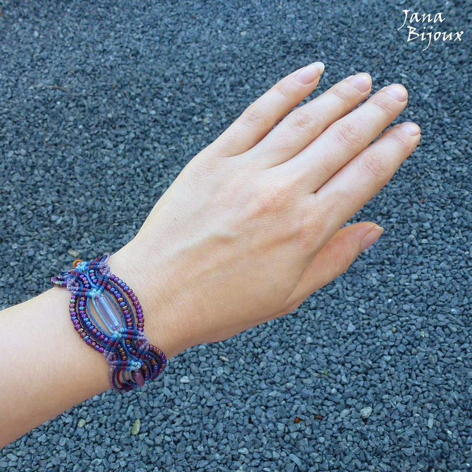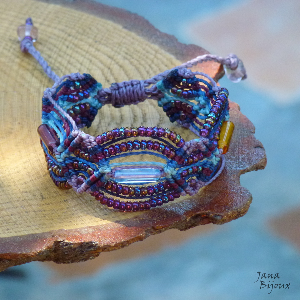 Serve até para pulso bem magro, com 3 canutilhos de vidro ( de cores azul, uva e ambar) miçangas meio metálicas com tons de roxo, amarelo, azul.. nas laterais distribuidas em zig zag . Nas pontas vidro lilás e miçangas
