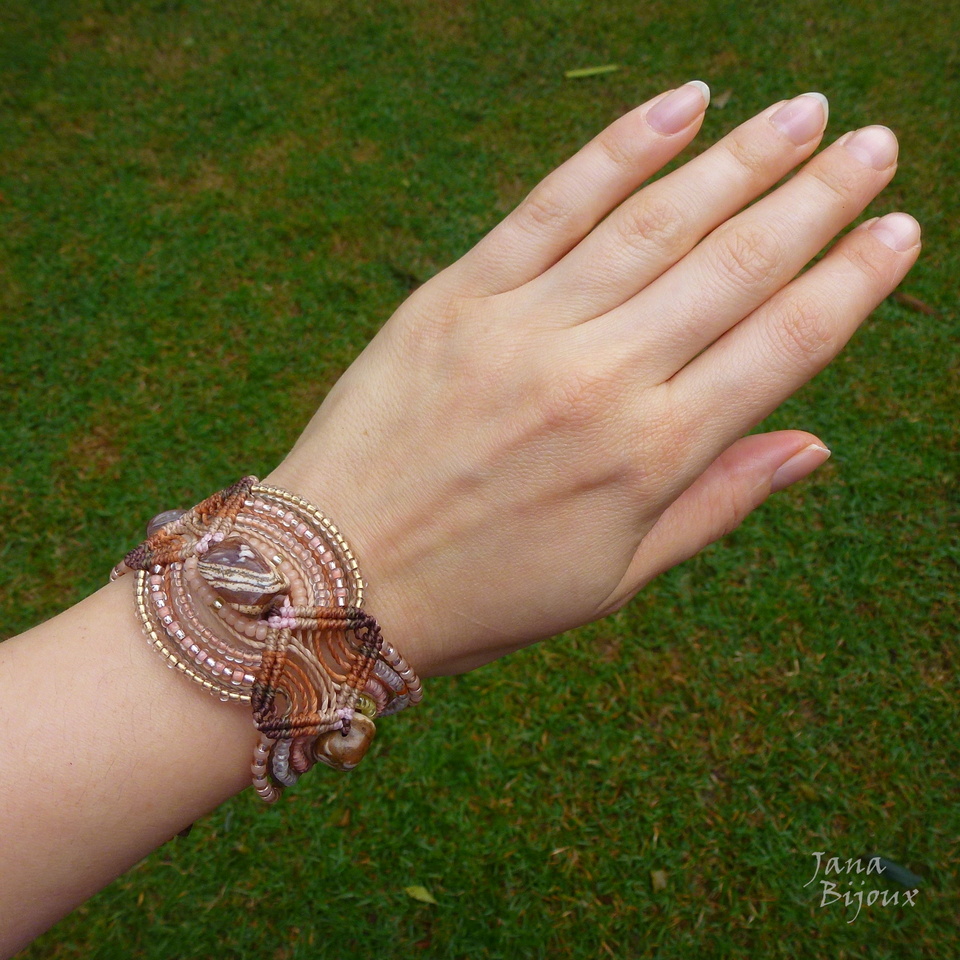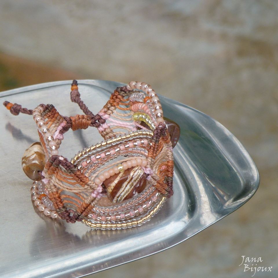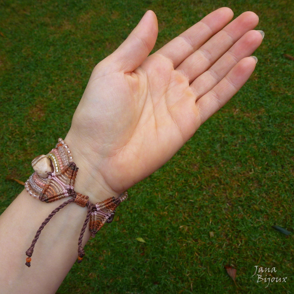 Pulseira discreta, chique de macramé, com miçangas nos ambos lados de cada pedra = jaspe zebra (contém 3 pç).