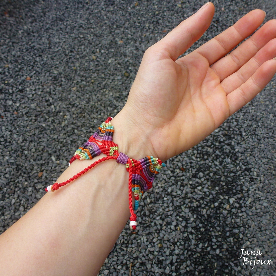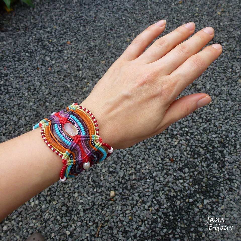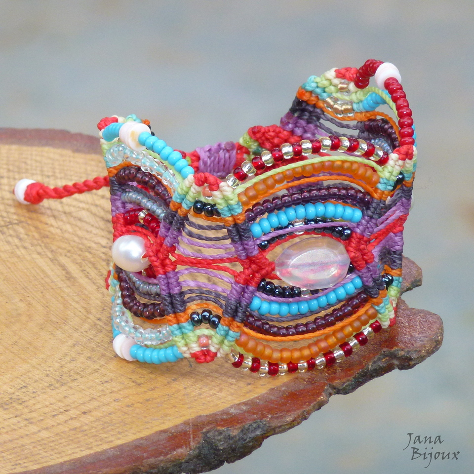 Pulseira larga, colorida, de macramé, com comprimento ajustável, pérolas,  discos de conchas lapidados, pedra natural e miçangas coloridas  nos ambos lados = (tem 3 peças centrais e 6 “campos” cheios de miçangas)..