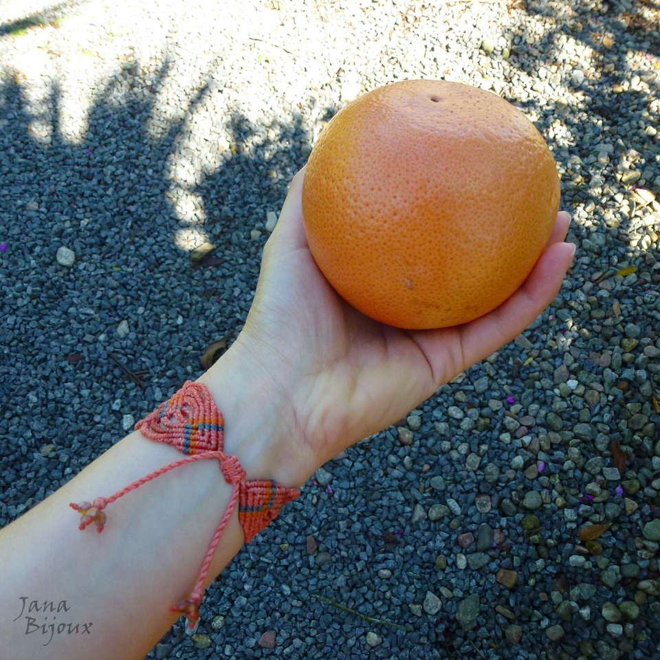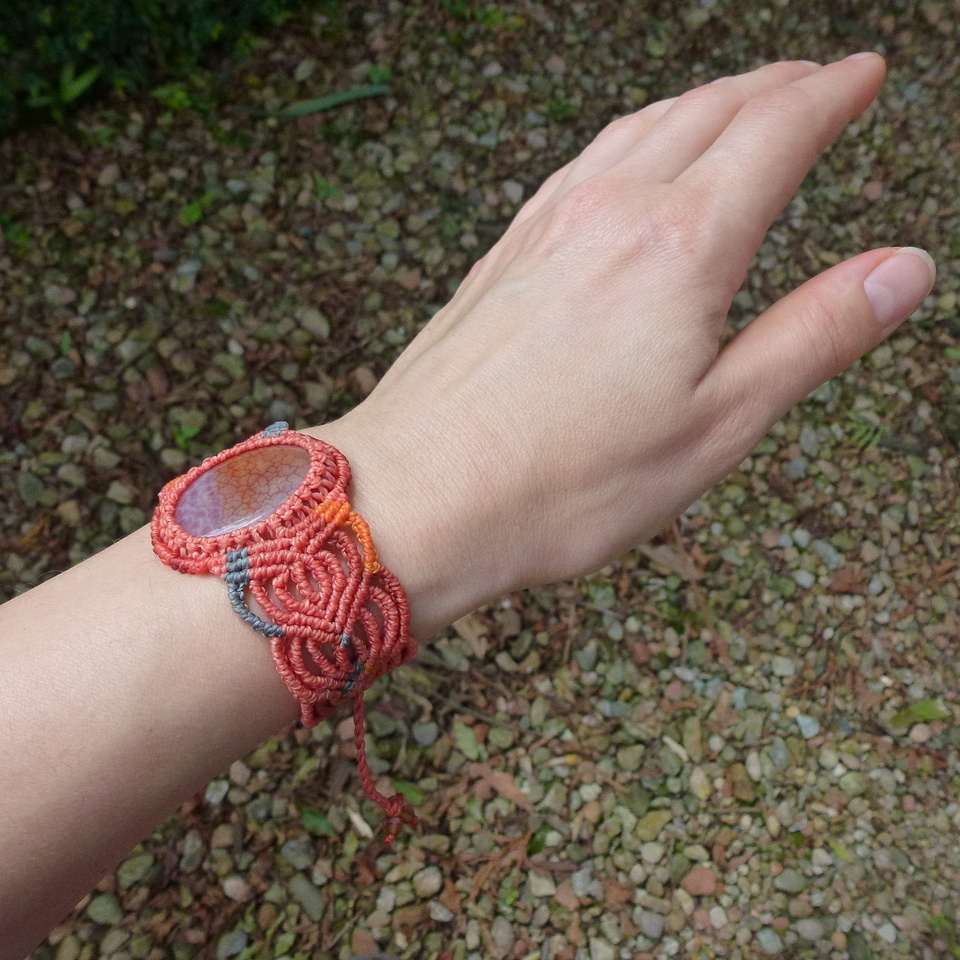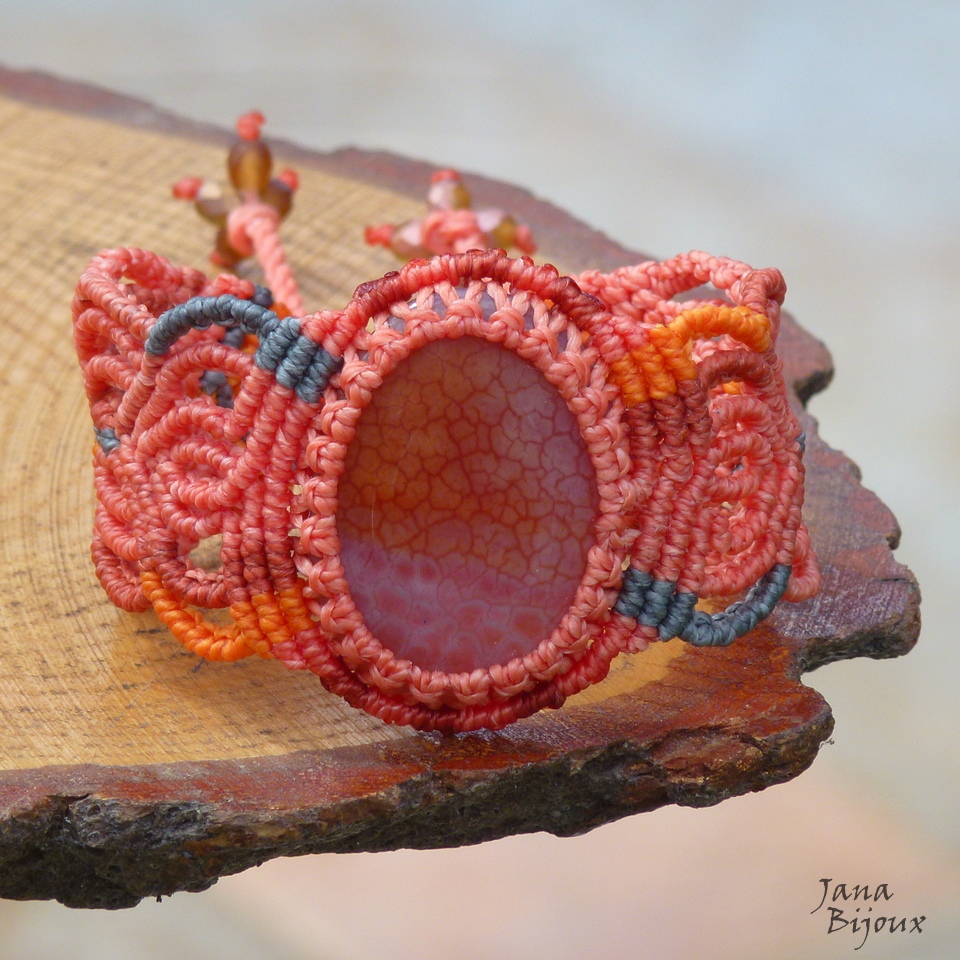 Pulseira em tons de coral rosa , com ágata de fogo e muito macramé, sem metal.