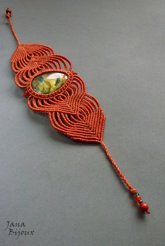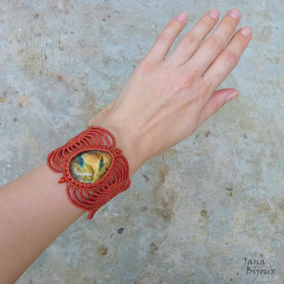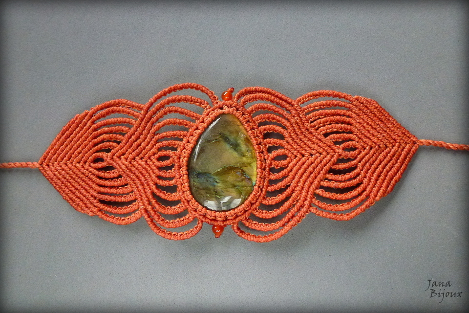 Maxipulseira com grande pedra labradorita.. importada de Madagáscar. A pedra mede 4,5 cm por 3,2 cm, com macramé em volta tem 4,7 cm. Comprimento ajustável, mínimo é 16,5 cm, max. 25 cm. Altura do macramé nas laterais é 5,8 cm.
