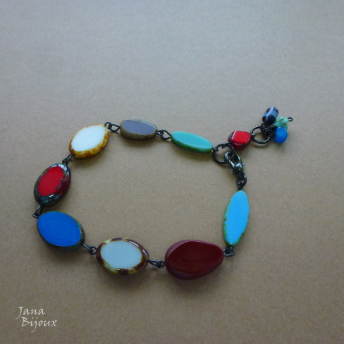 n45 24/01/2013VENDIDOS ( Prodáno)Jana Bijoux Pulseira. Náramek ze skla. Vyroben na dvě možné varianty délky, jedna 18,5 a druhá možnost 20,5 cm. Je na kovodílech s povrchovou úpravou černého zinku.
