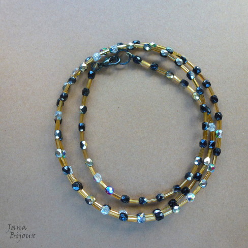 Colar-pulseira 72 cm, pode ser usado de ambas maneira, de cristal delicado, dourados e pretos com brilhos dourados, como pulseira da certinho 4 voltas, como colar pode ser facilmente usado com outros colares em várias camadas por ser delicado, acabamento em zinco preto R$ 28,00 (última foto é só demonstrativa para ver tamanho com a mão, colar da foto é um pouco mais comprido e já está vendido).