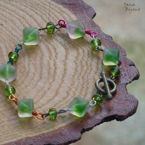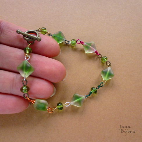 Pulseira de vidro com diversos metais coloridos, acabamento americano em ouro velho em forma de T, comprimento 20 cm R$  22,00
