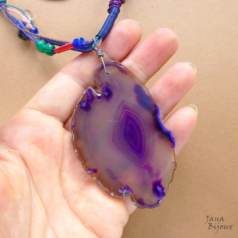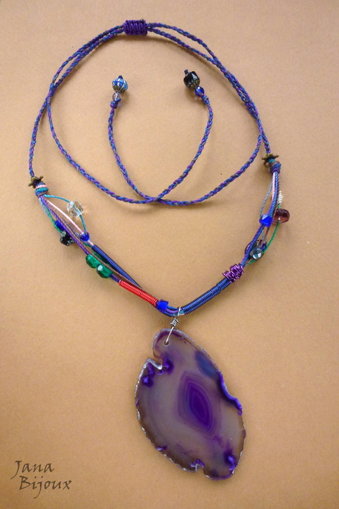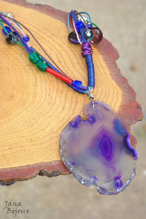 Colar comprido, meio industrial, meio com cara de reciclado, jovial, assimétrico, mas cheio de detalhes interessantes, peças de ouro velho, peças feitas a mão de arames importados coloridos, vidros luxuosos de diversas cores combinando com cores de fios, linda pedra natural de 7 cm, tingida, gancho feito de inox a mão, comprimento ajustável, conforme puxar as cordinhas. R$ 35,00