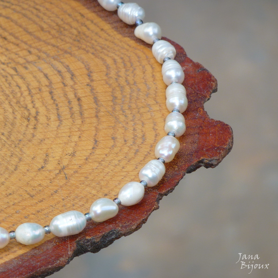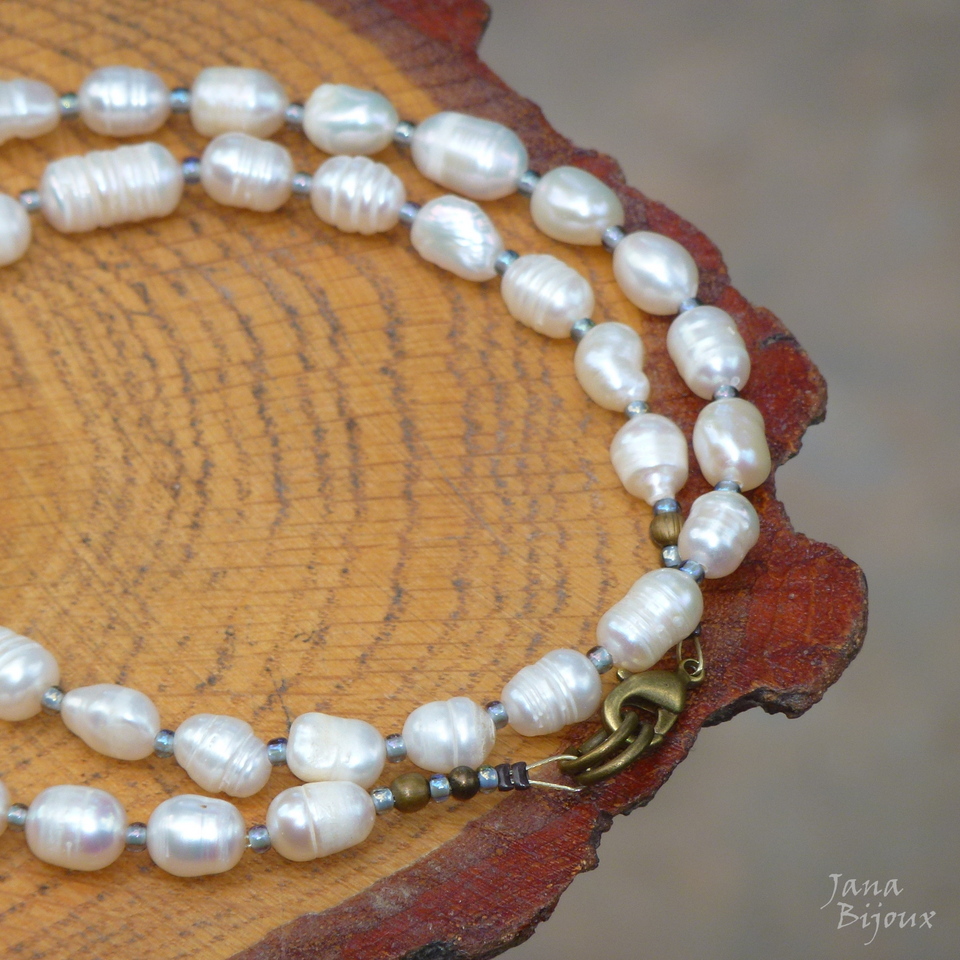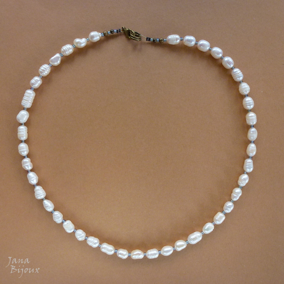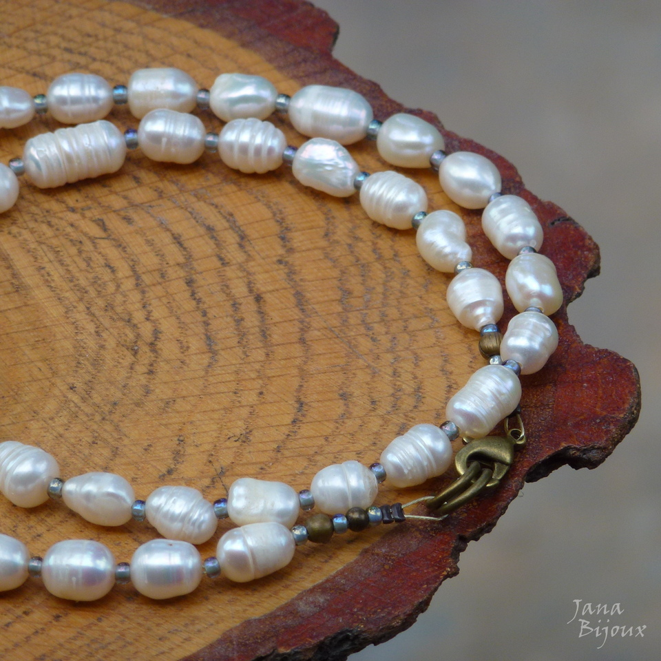 Colar curo 50 cm de pérolas tamanhos G, naturais de água doce, rústicas, irregulares e luxuosas, miçangas no meio de cada uma, acabamento ouro velho R$ 42,00