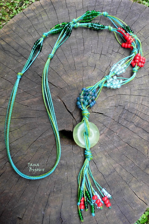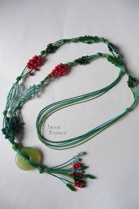 p24 29/10/2010VENDIDOS ( Prodáno)Jana Bijoux Colar comprido, sem metal algum (que termina e começa na frente), com medalhão de pedra jade e 6 fios no cada lado com misangas de vidro R$ 36,00. RESERVADO