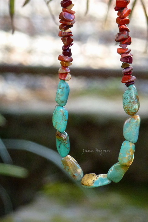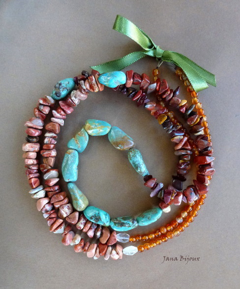 Colar comprido feito de várias pedras, ágata, jaspe em 2 tons , quartzo e outra pedra meio azulada e verde (não sei o nome) e fita (que pode ser facilmente trocado pelo fecho preto ou banhado à prata) R$ 55,00.
