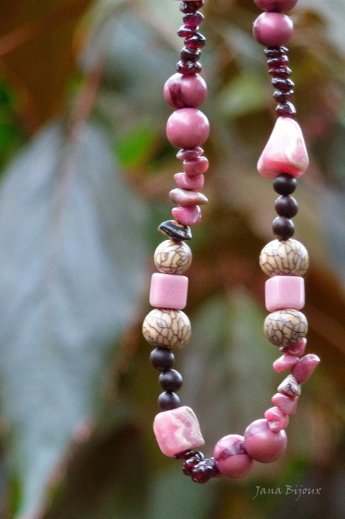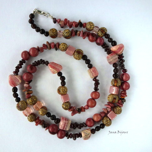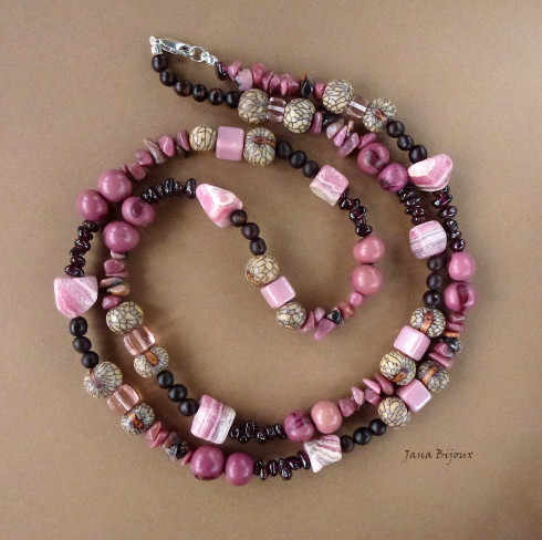 DLOUHÝ NÁHRDELNÍK SE STŘÍBRNÝM ZAVÍRÁNÍM A ZAKONČENÍM 925 /1000 , RODOCHROZITY, RODONITY, GRANÁTKY, SKLEM A SEMÍNKY.