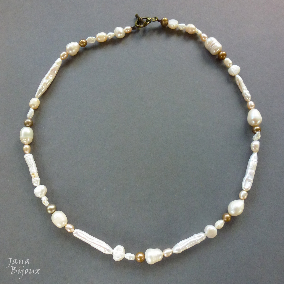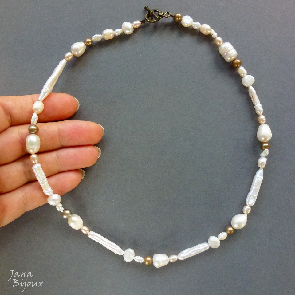 p358 02/05/2017VENDIDOS ( Prodáno)Jana Bijoux Colar curto 47,5 cm com diversos tipos (8!) e tamanhos de pérolas de água doce, acabamento americano em formato de T, ouro velho R$ 59,00