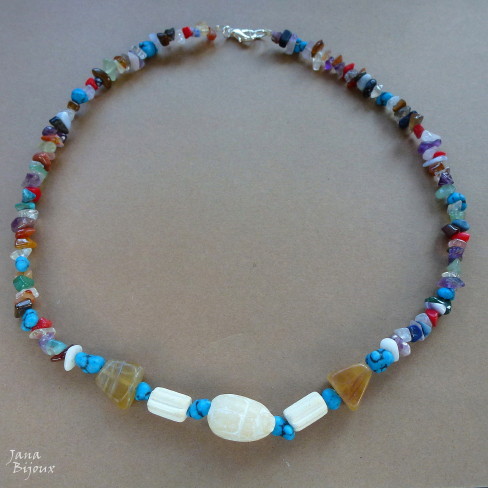 Skarabeus z mastku, keramika, duhový fluorit e zlomky různých kamenů. Zavírání postříbřené, na přání můžu vyměnit za stříbrné.