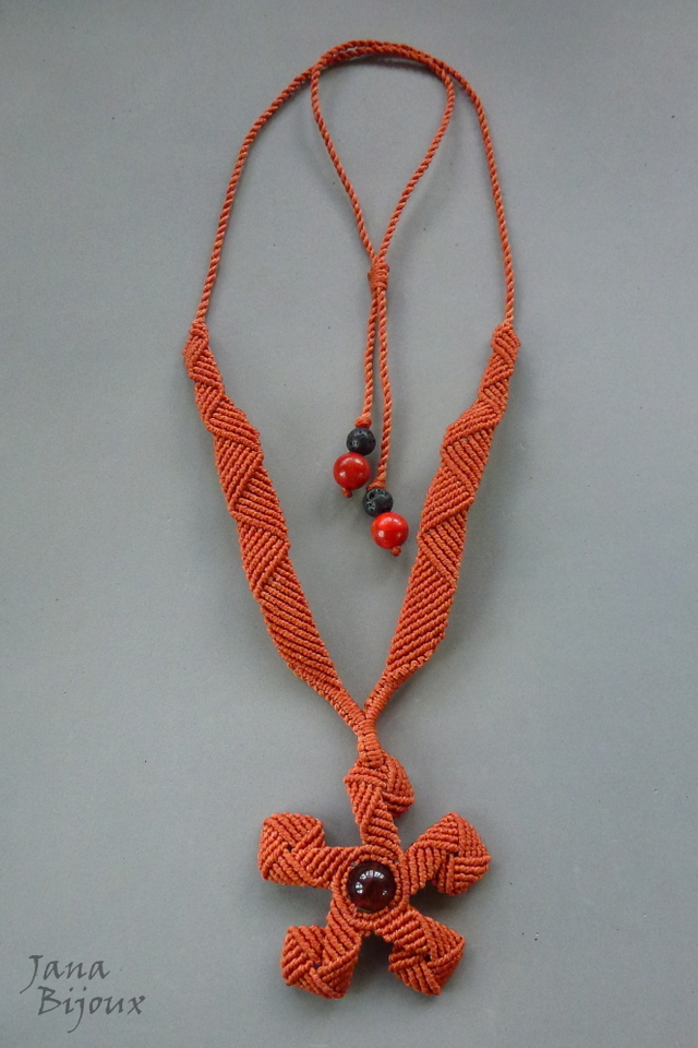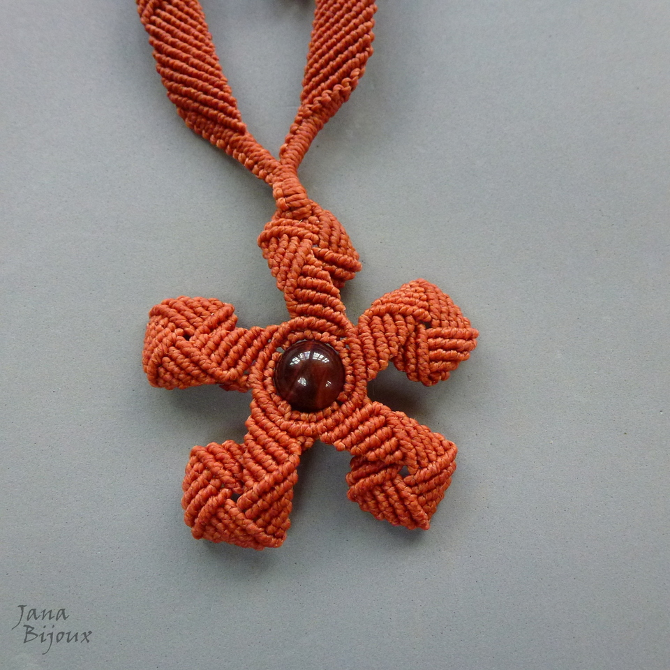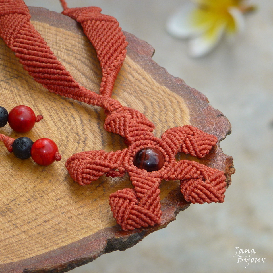 Colar com flor meio tribal… com a bola de pedra do meio, fio de cor vermelho telha e uma conta grande de olho-de-boi , pedra natural de 1,2 cm. A flor inteira mede 6 cm.