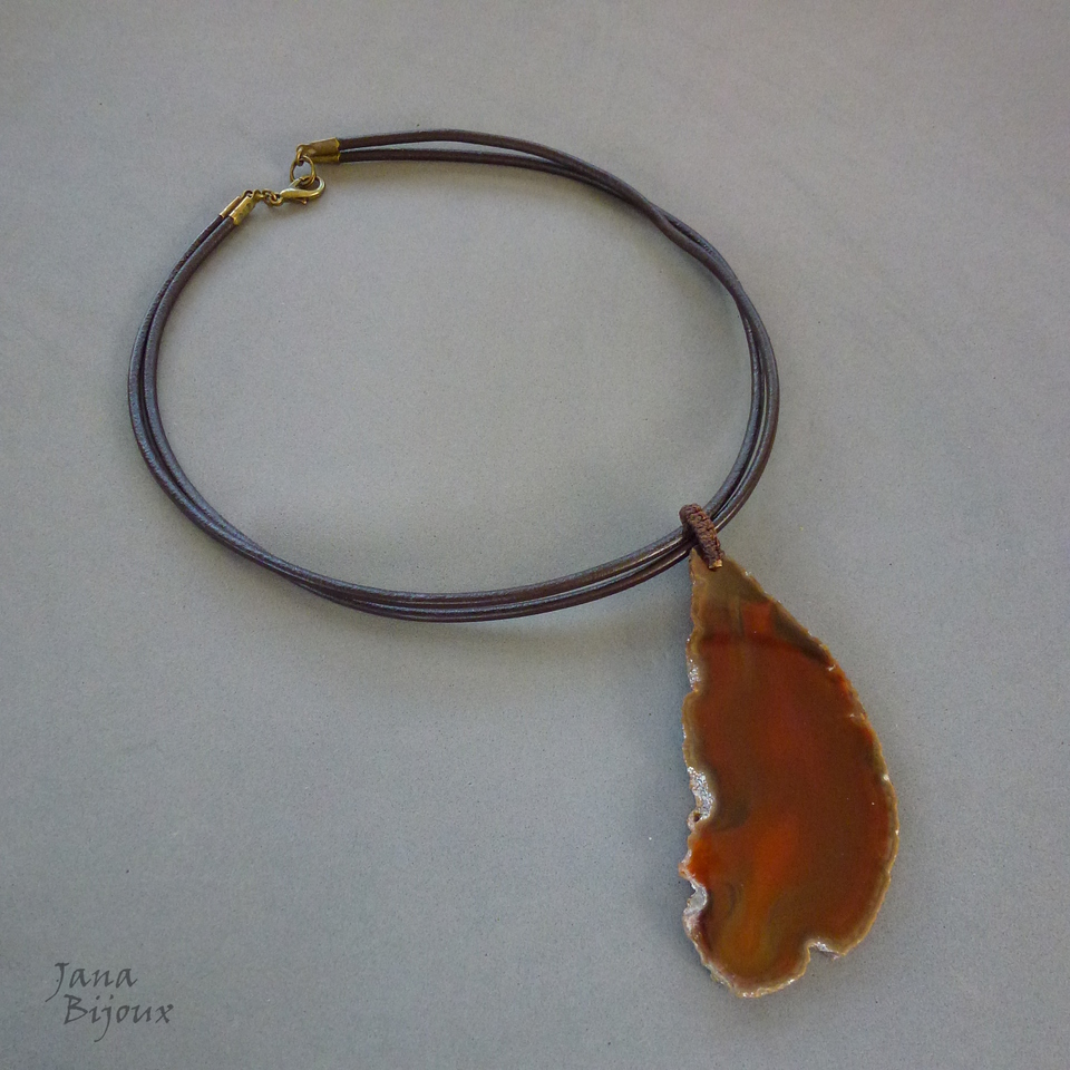Colar curto 46,5 cm, de couro duplo cor café e ágata vermelha de 9 cm numa alça de macramé. R$ 25,00