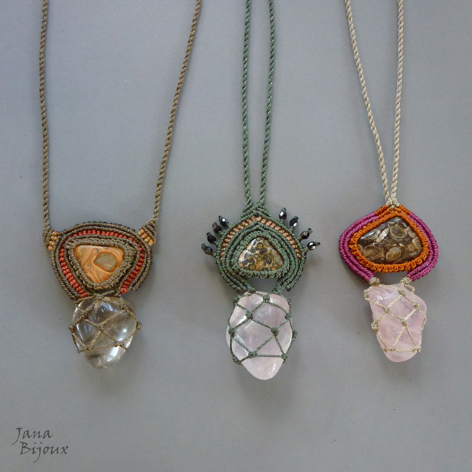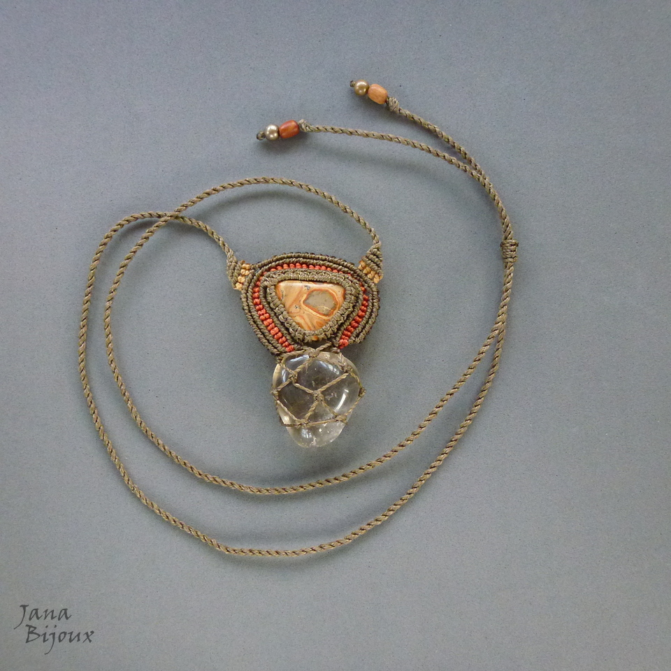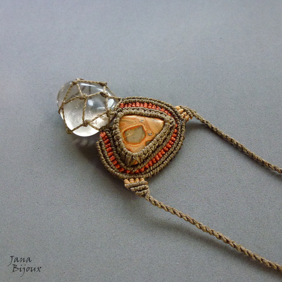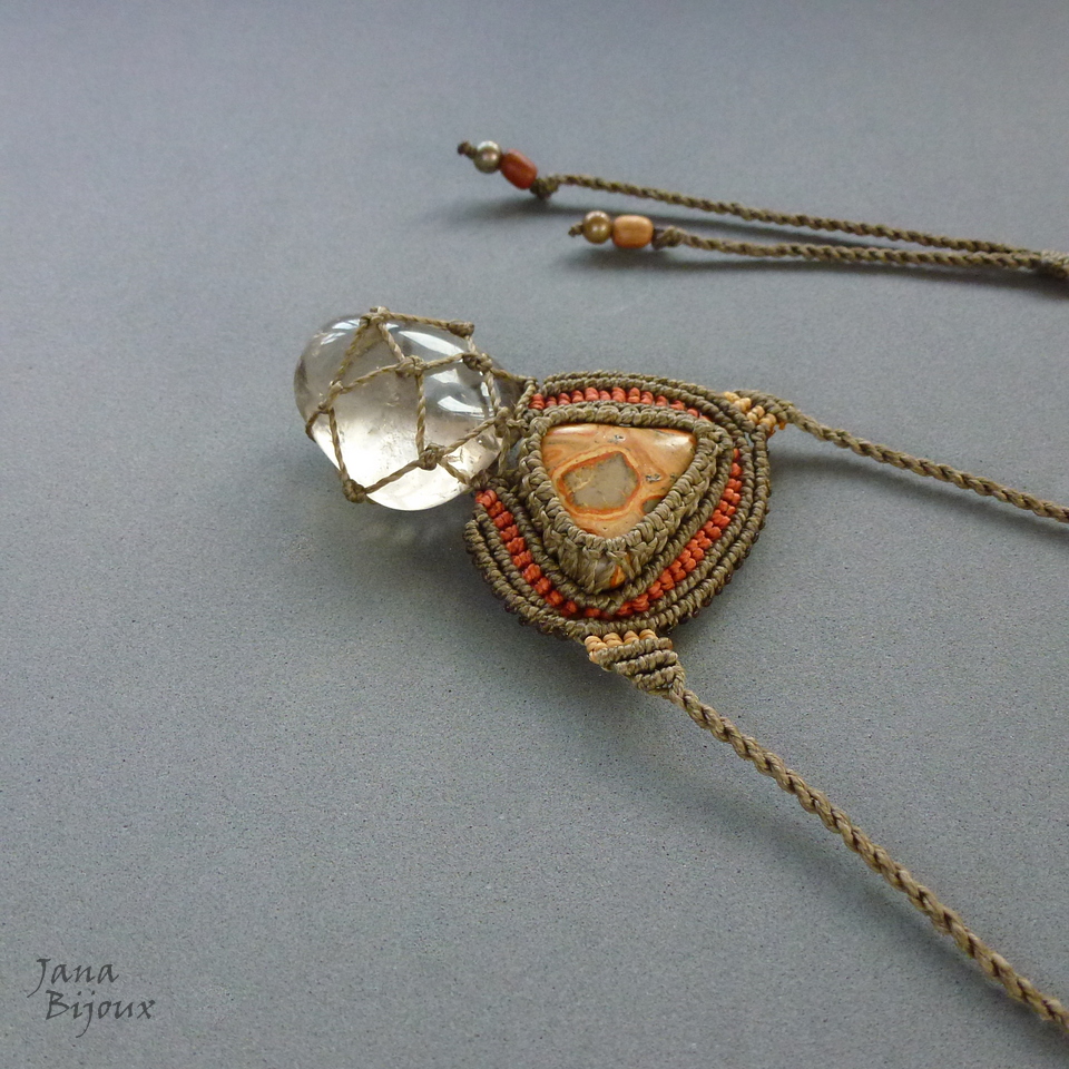 Colar de macramé com pedra de vulcão ( de Peru) e pedra quartzo.