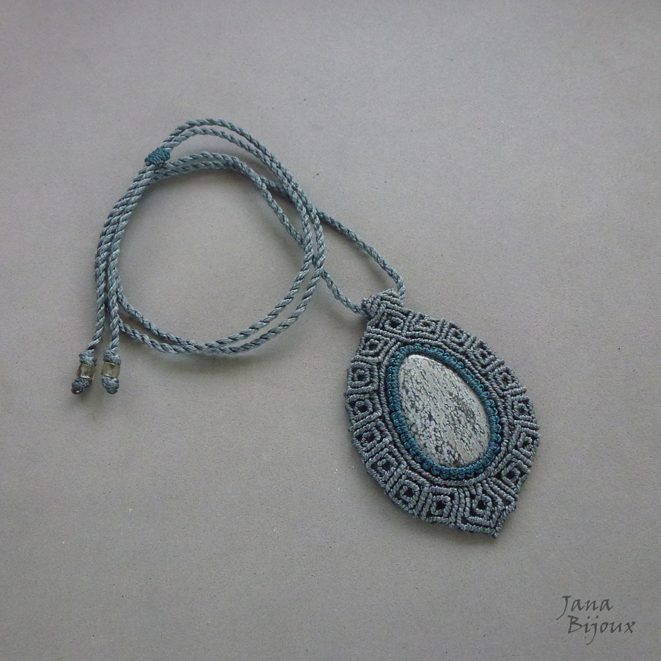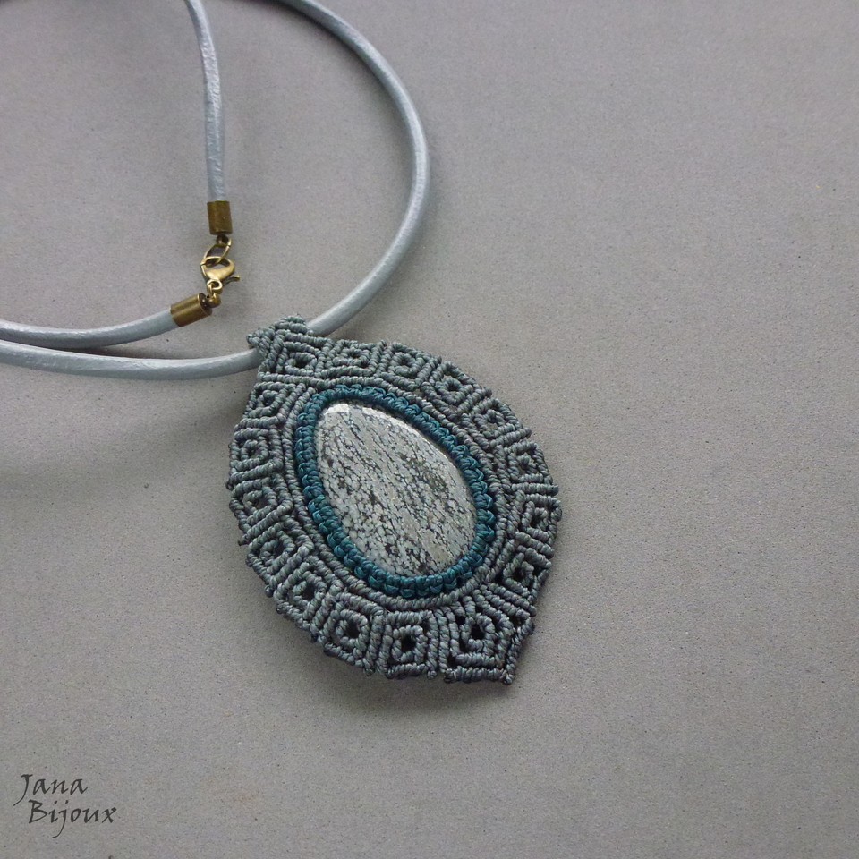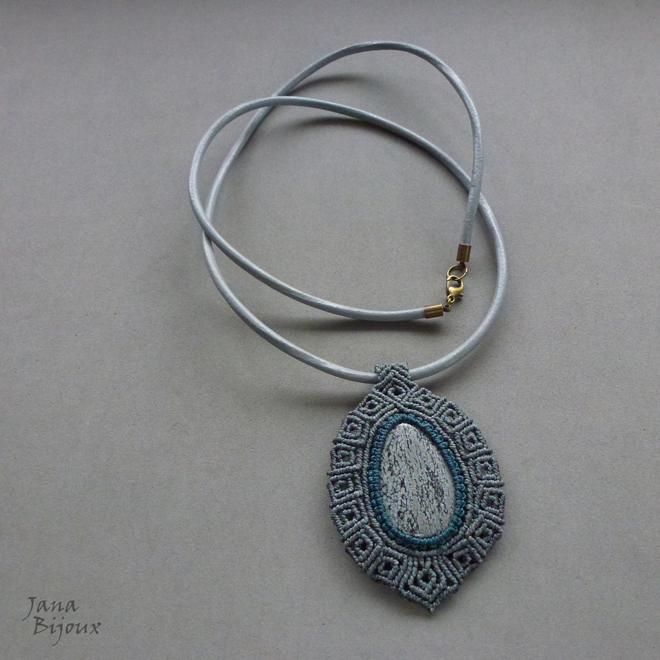 Colar unissex, com obsidiana ” flocos de neve” , macramé e couro importado de 84 cm e cor cinza.