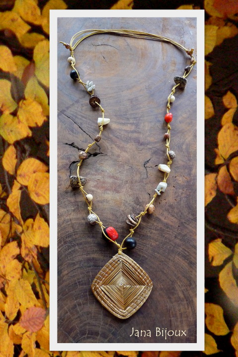 DLOUHÝ NÁHRDELNÍK SE ZLATOU SLÁMOU, SEMÍNKY A EXOTICKÝM DŘEVEM 277,00 Kč.