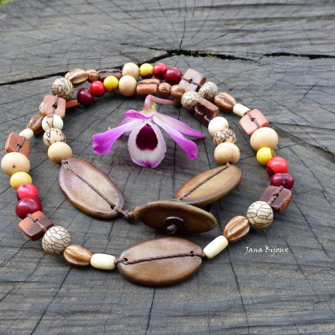 Plody gaupuruvu a dřevo na náhrdelníku jsou prošity z obou stran, semínka jsou zde zastoupena v různých podobách. Máme zcela přírodní ve svých původních tvarech, také tu naleznete semínka obroušená do válečků dominující barevná semínka jsou barvená (žlutá, červená světlá a červená tmavá).