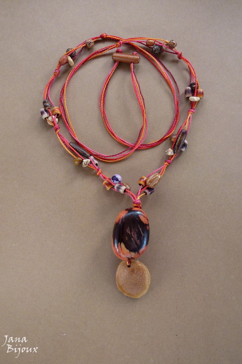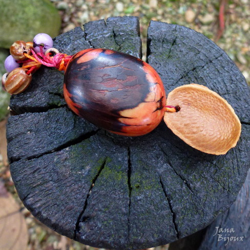 Centrální plod je krásný, velký, barvený taguá ořech, který měří 3,6 cm a má oranžovo-růžovou barvu (není svítivá ani nevypadá nepřirozeně, uměle, naopak krásně se zbytkem náhrdelníku ladí a působí zdravě). Pod ořechem je provrtaný plod ze stromu Pterodon sp má 3 cm.