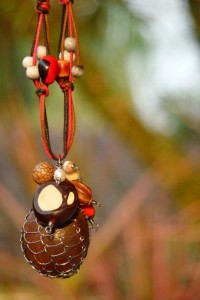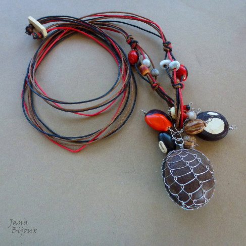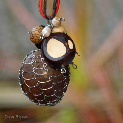 Dlouhý náhrdleník s velkým semínkem obšitým nerez drátem, a 9-ti druhy dalších semínek + 1 perla. Jedno velké semínko kávové barvy (hymenaea courbaril ), je navíc ještě obroušeno. Obyčejně je semínko totiž celé hnědé, jako kávové zrnka, ale broušením se dostanete na vnitřní část, která je smetanová, vytvářejíce tak krásnou a zajímavou kresbu.