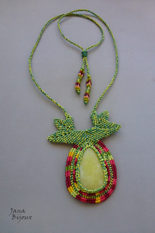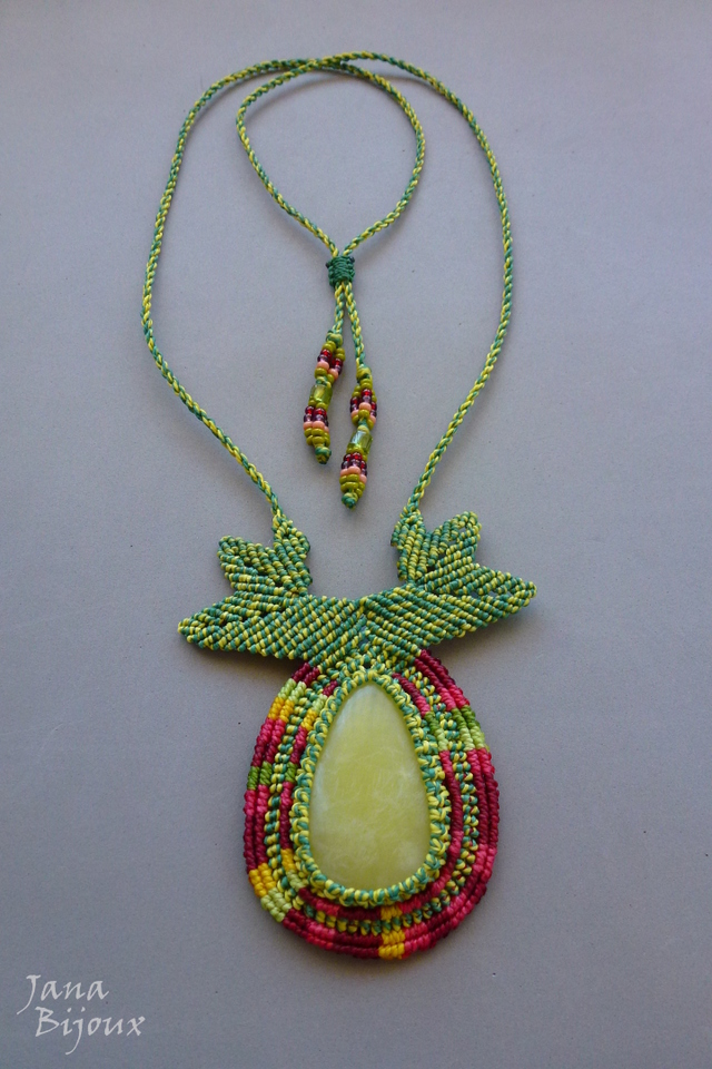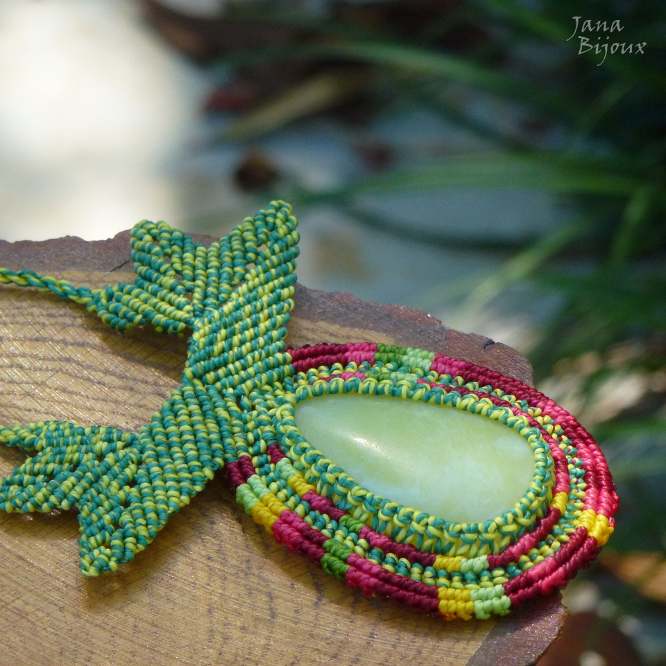 Colar com gota de serpentina – jade chinêsa e macramé. Inspirado nas flores da família GLORIOSA. Lindas, exóticas e exuberantes!