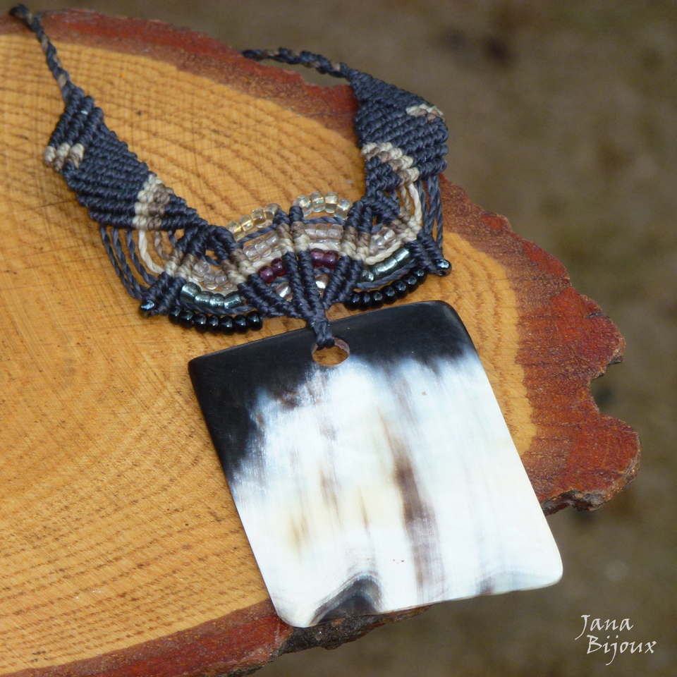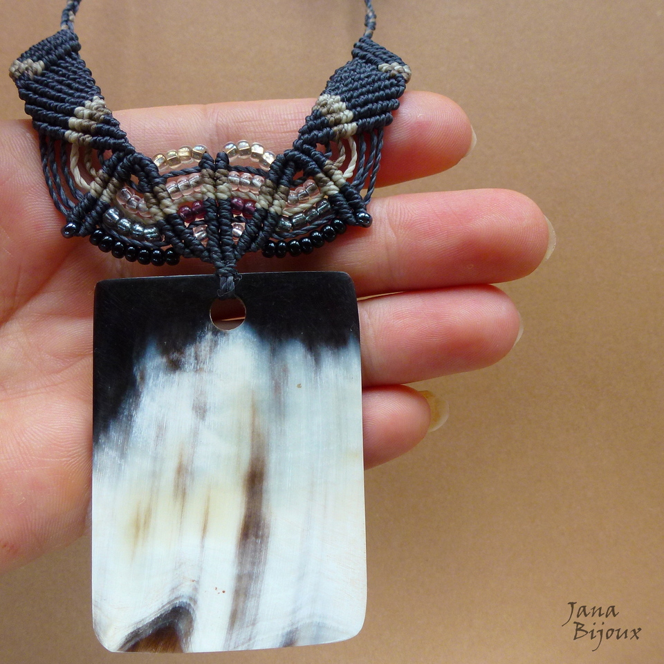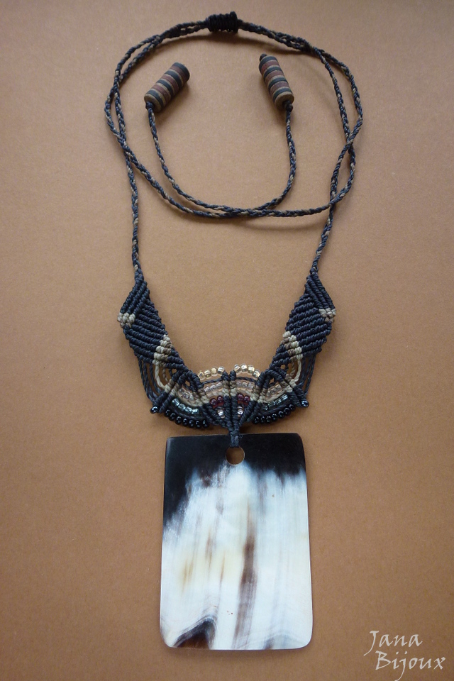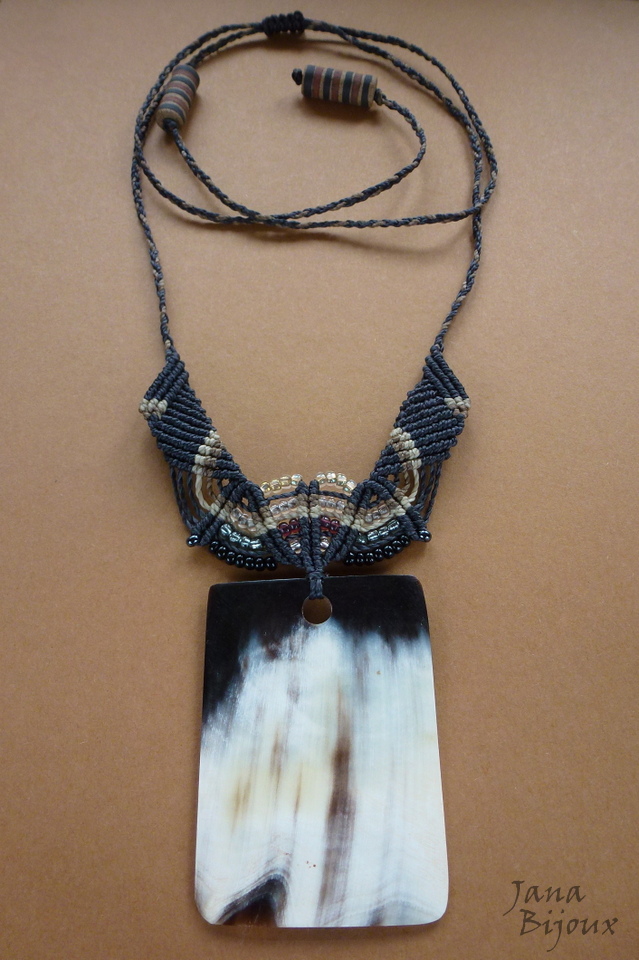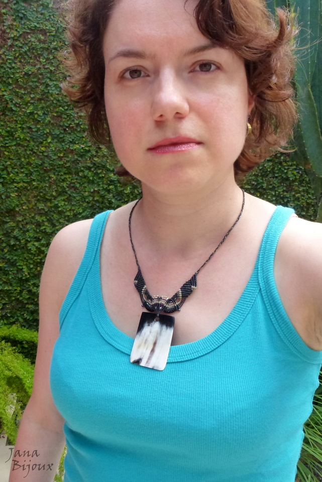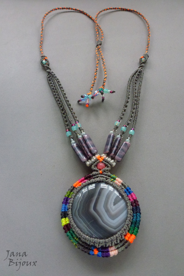 Esta em particular demorei de decidir o que farei com ela.. já que o cinza é um pouco sóbrio e sério demais. No final decidir apimenta-la com neon e outras cores, espero que acertei :-). Pode parecer na foto assim muito carnavalesco, mas na verdade as cores só são em volta da pedra para acende-la e depois perto do pescoço com neon… para dar um pouco de cor no rosto. Vidro colorido nas pontas fica nas costas. O colar é bem moderno, contemporâneo, diferente, mas continua ser de bom gosto eu acho