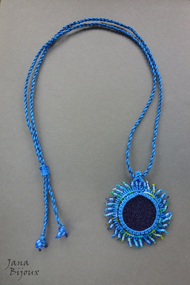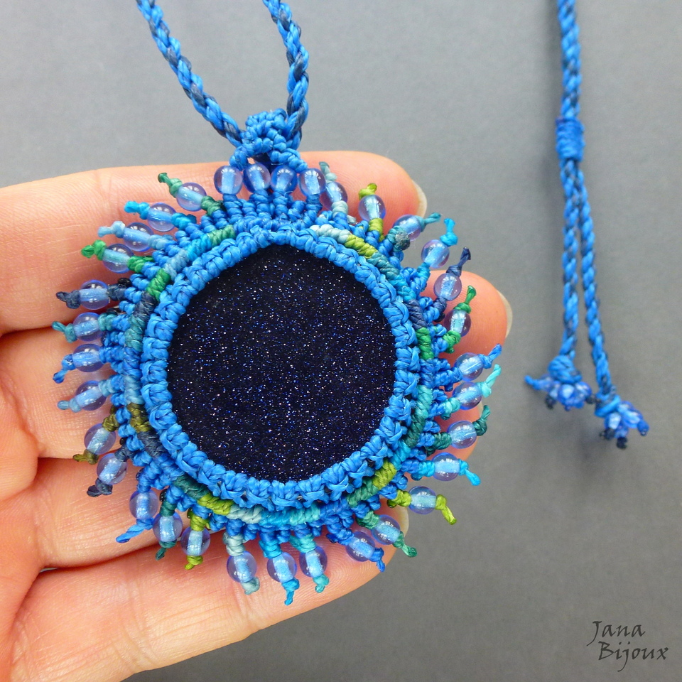 Pedra- é polida, tem brilho, mede 3,5 cm e segura só com nós, sem cola e sem furo. Com macramé em formato de sol, tons de azuis e verde. Pingente inteiro tem 6,7 cm de altura. Tem livre movimento no cordão.