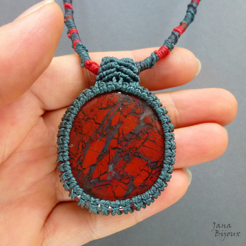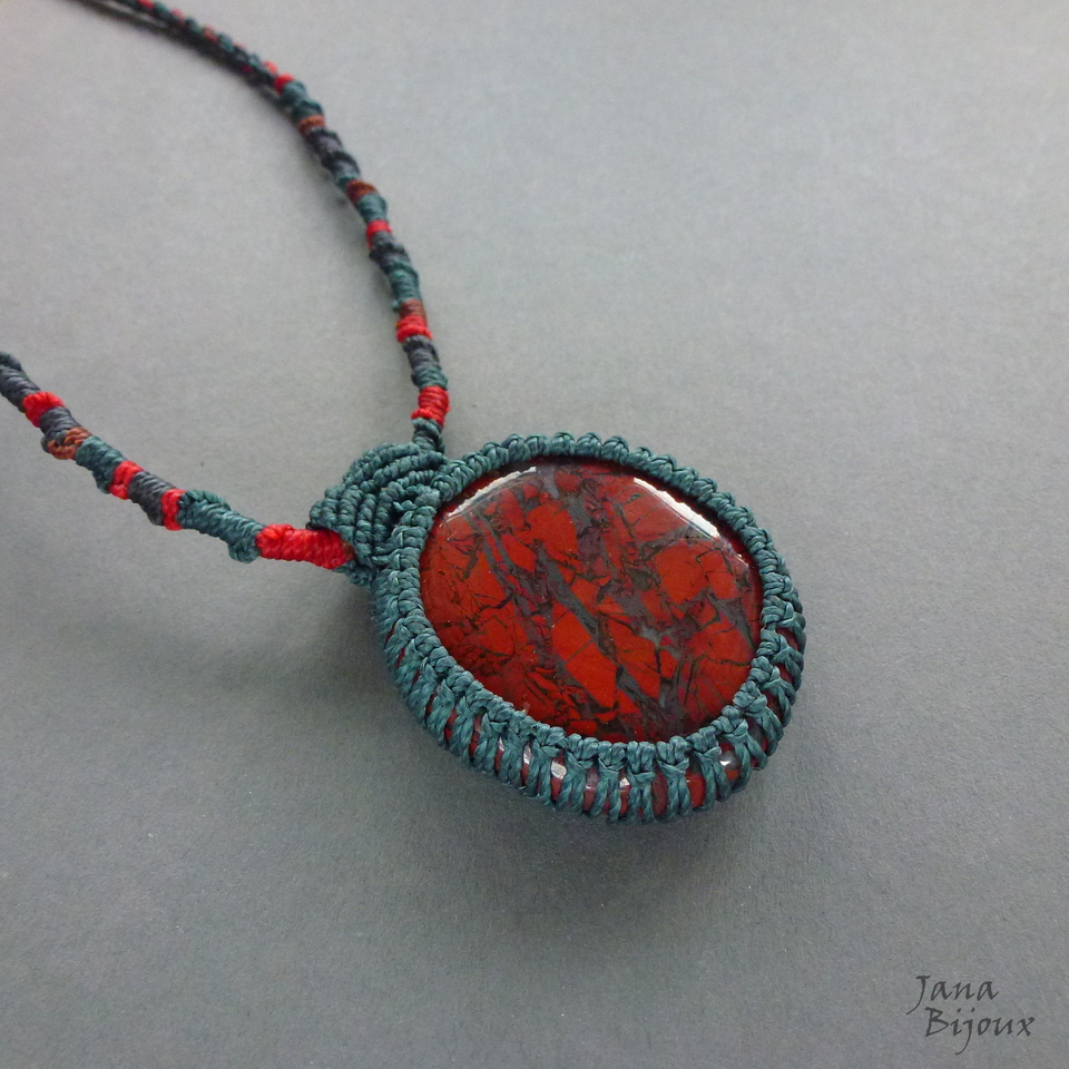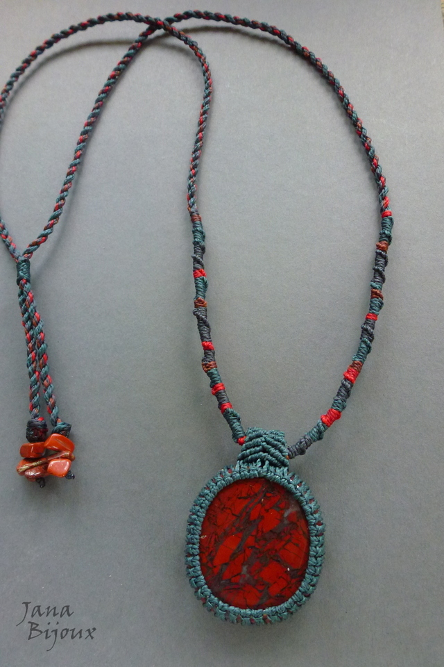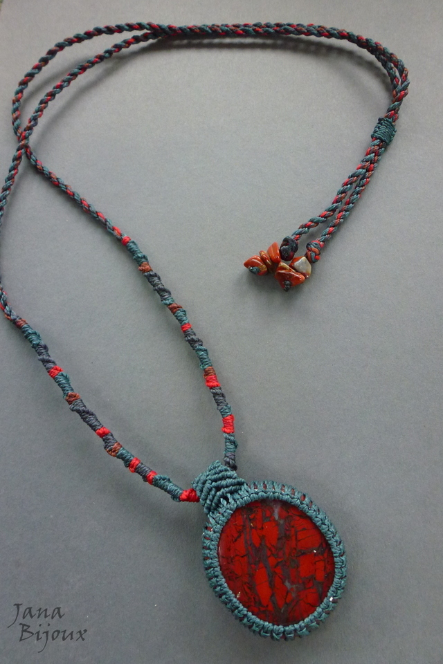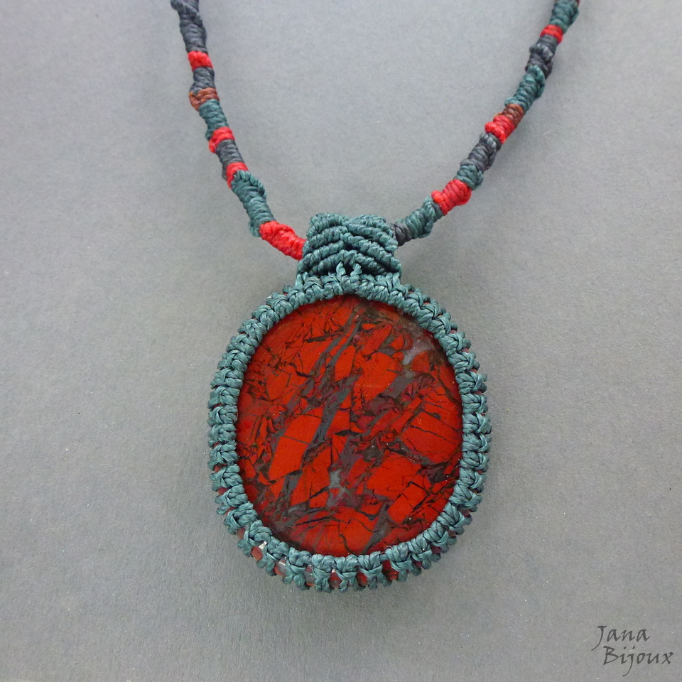 Colar com jaspe africano, vermelho sangue, com macramé Comprimento ajustável,