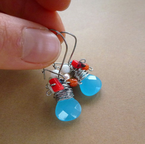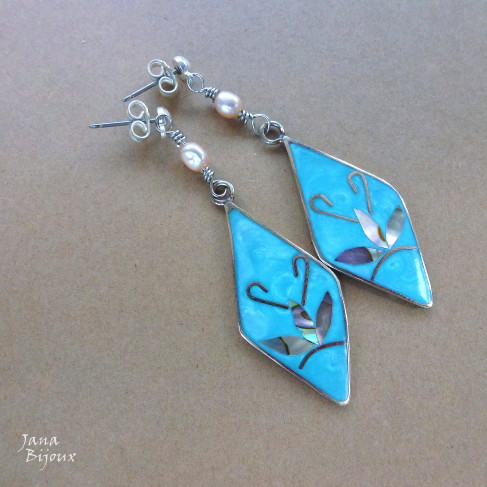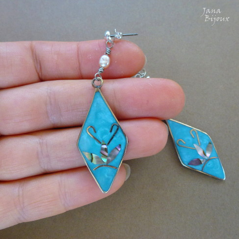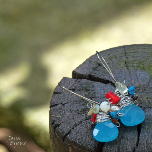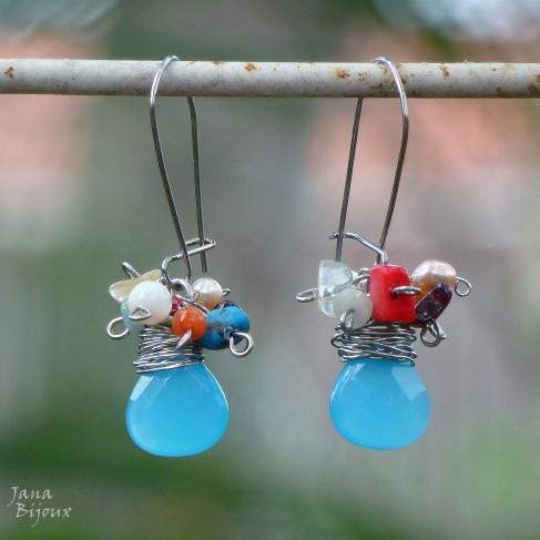 Brincos compridos 7cm com fecho de prata e parte de baixo com aço inox. Bolas de cloisonné 1,2 cm, pérolas de água doce e gotas de pedras naturais. Arame torcido na mão, artesanal, antialérgico R$ 38,00.
