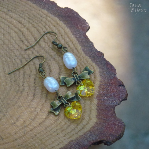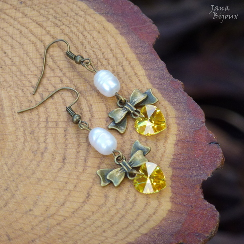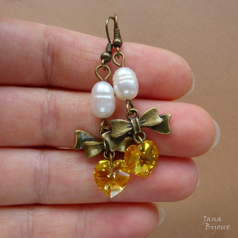 Brincos delicados com fecho sem niquel e chumbo, em ouro velho com lindos cristais Swarovski amarelo e pérolas de água doce. Comprimento 5,5 cm. Os coraçoes tem 1 cm x 1 cm R$ 27,00 PEÇA ÚNICA