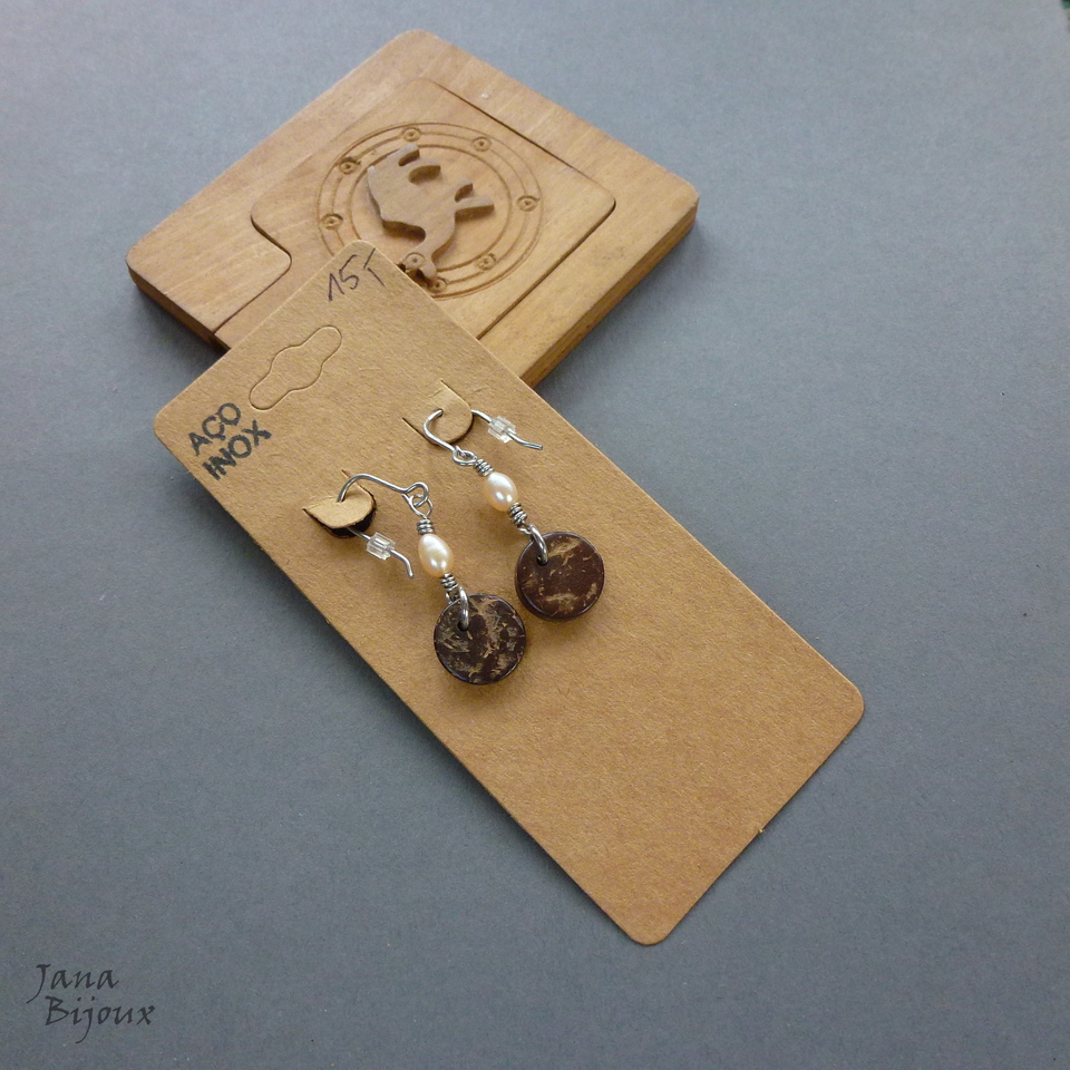 Brincos artesanais de 4,3 cm de aço inox, coco e pérolas de água doce, tarraxa de silicone. R$ 15,00