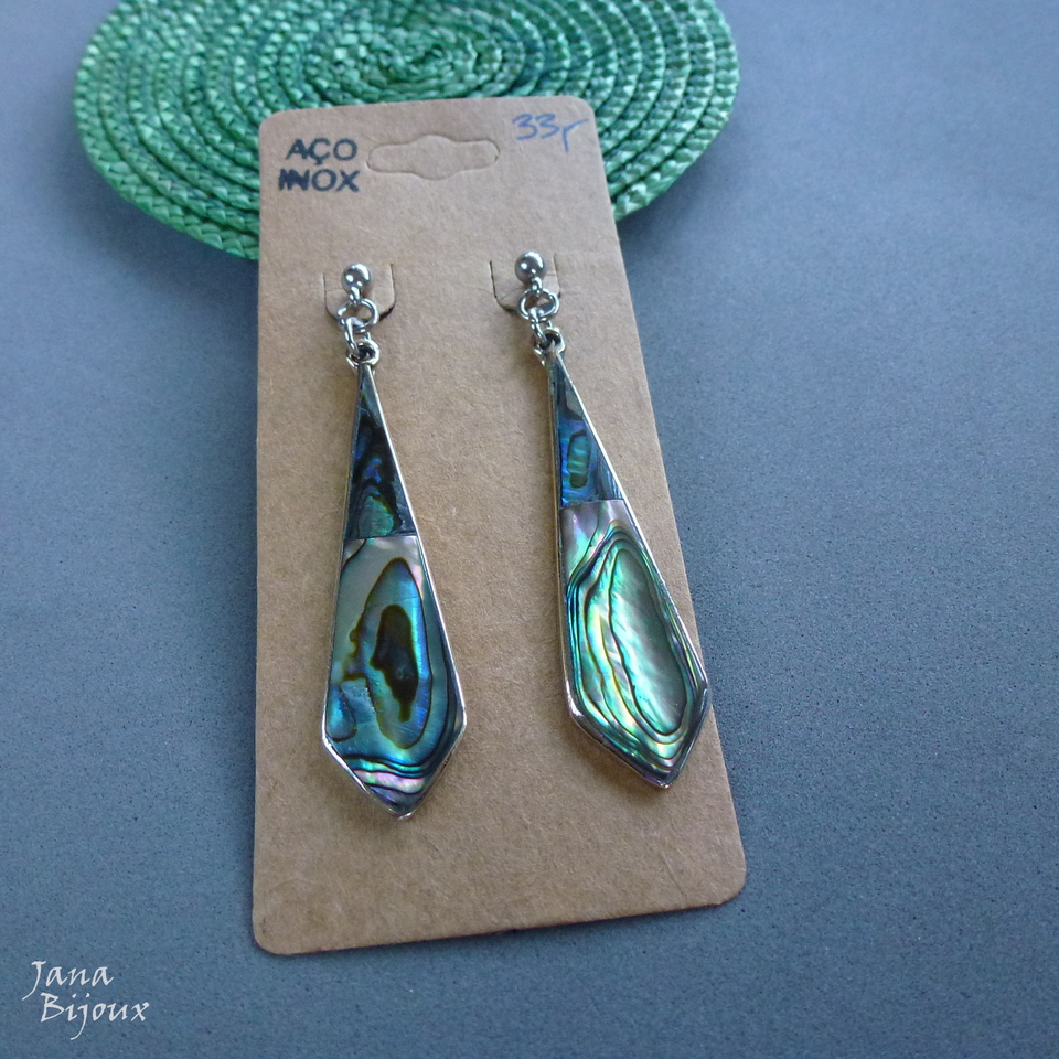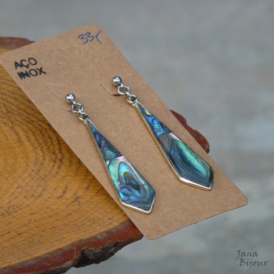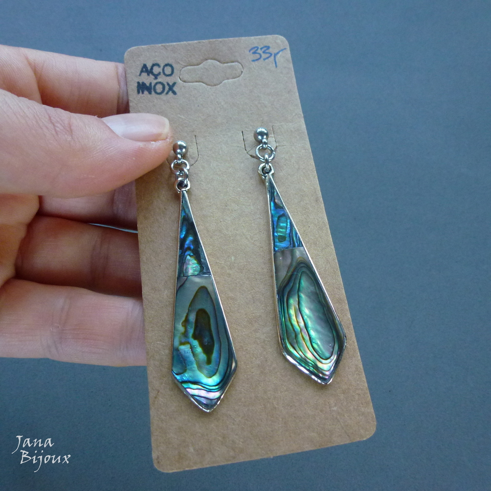 Brincos compridos 6,5 cm de alpaca com fecho de aço inox, abalone. R$33,00