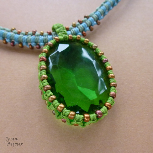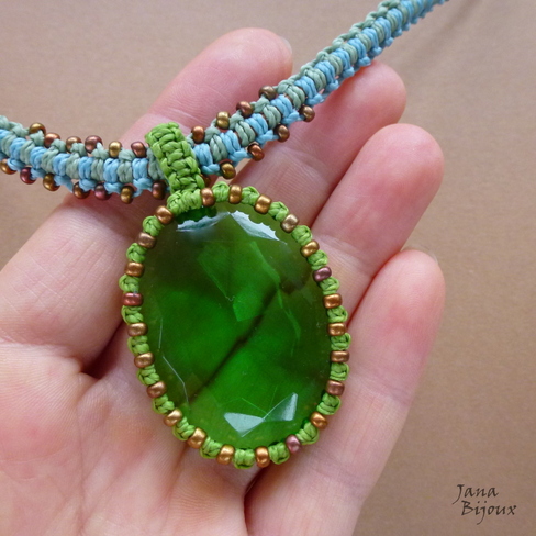 Cabochão cor verde esmeralda, mede 4 cm por 3 cm, é grosso e com lapidação cónica num lado. O medalhão não tem furo, segura sem cola só com macramé, pingente inteiro tem 5 cm.