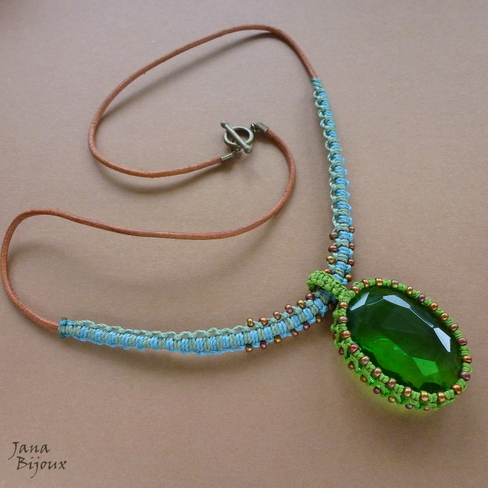 Colar médio 56 cm com cabochão artesanal de vidro verde, lapidado a mão, macramé em volta com miçangas mescladas metálicas e couro natural e macio. Acabamento em foramto T, ouro velho.