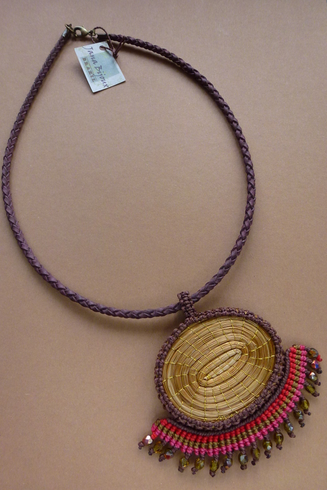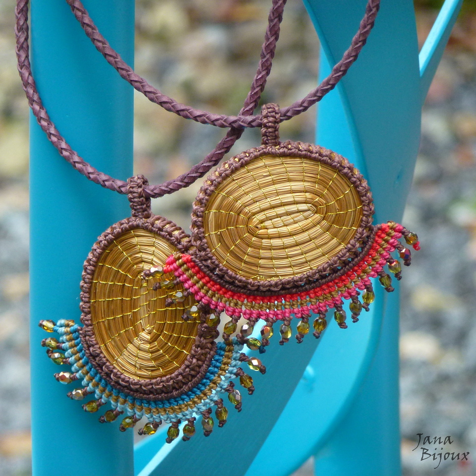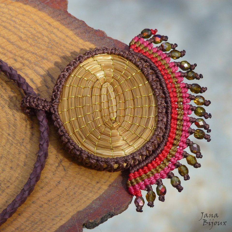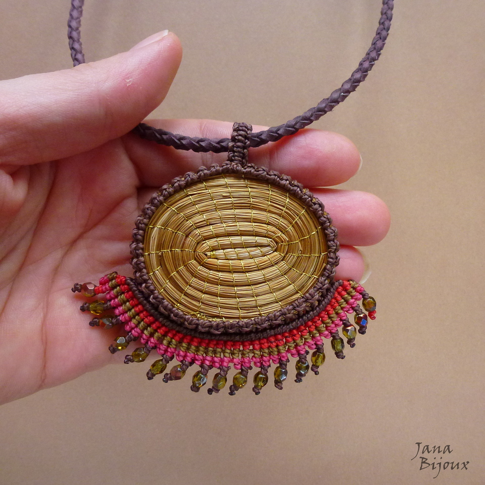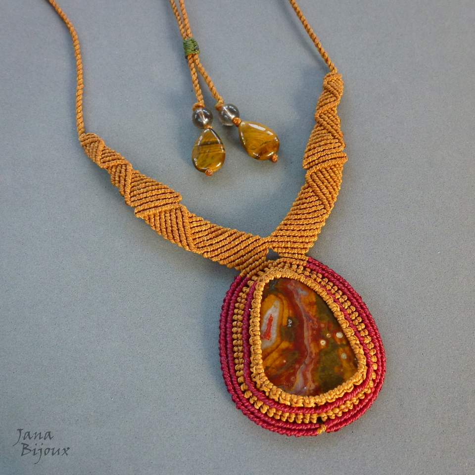 Linda pedra quartzo de ferro da República Tcheca com rara coloração, num colar de macramé.
