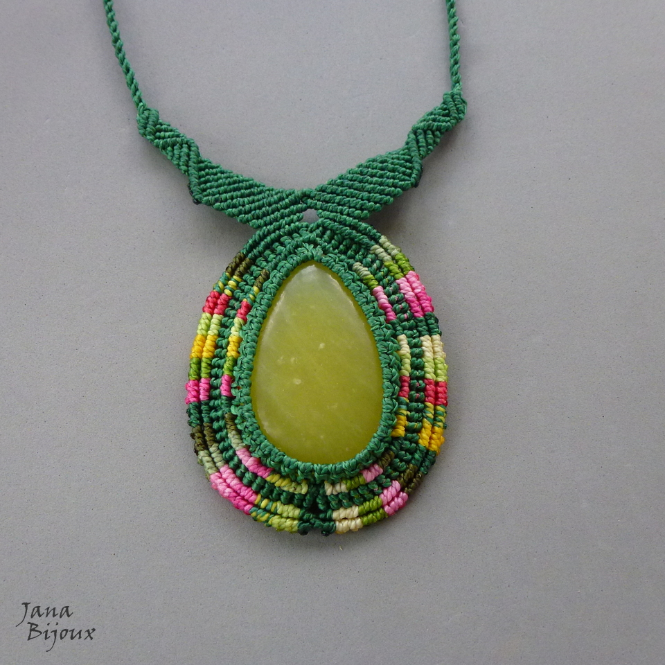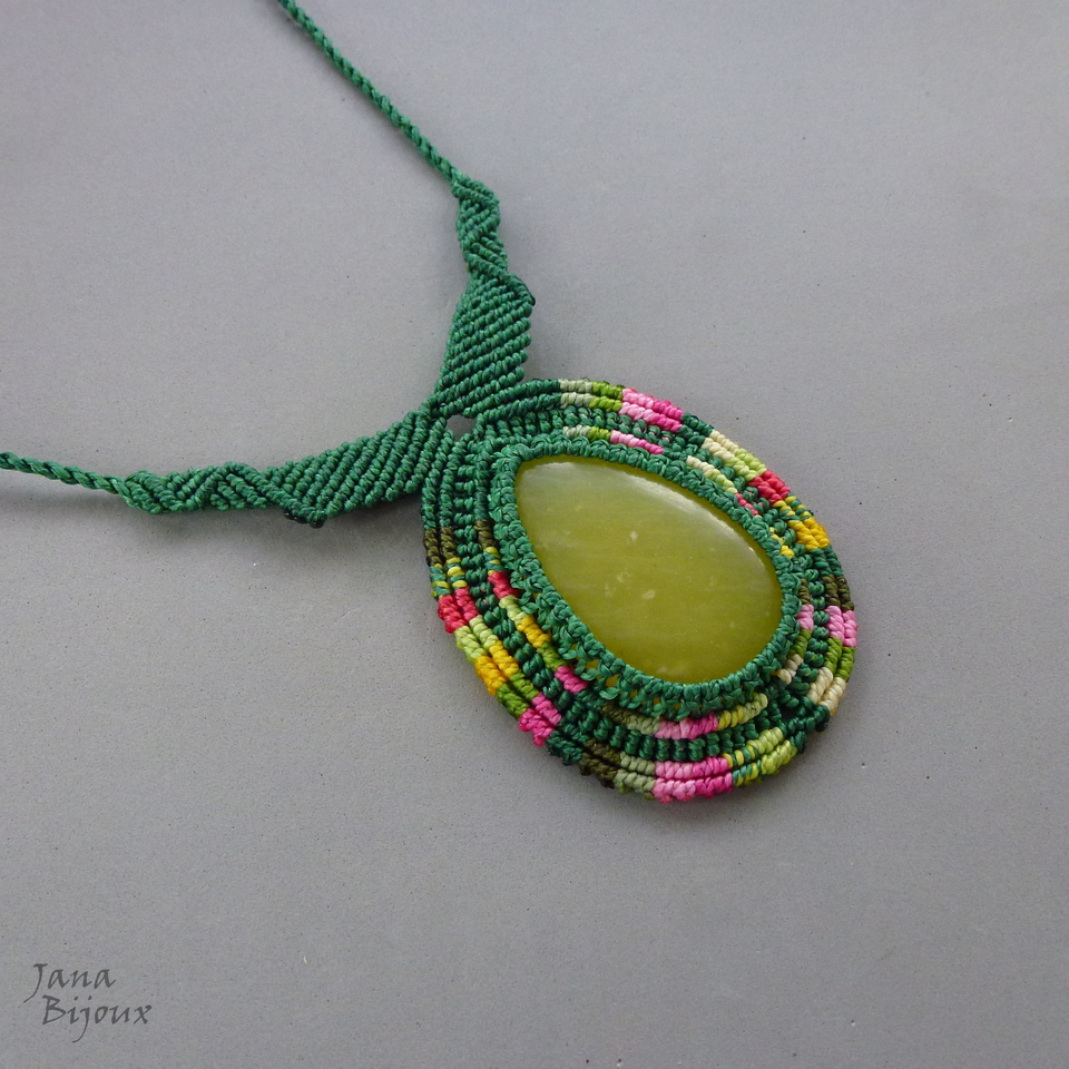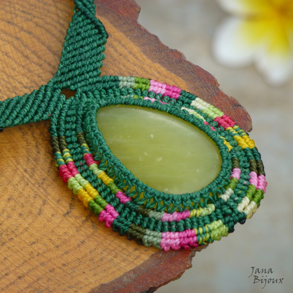 Colar com gota de serpentina – jade chinêsa e macramé. Inspirado nas flores da família GLORIOSA. Lindas, exóticas e exuberantes!