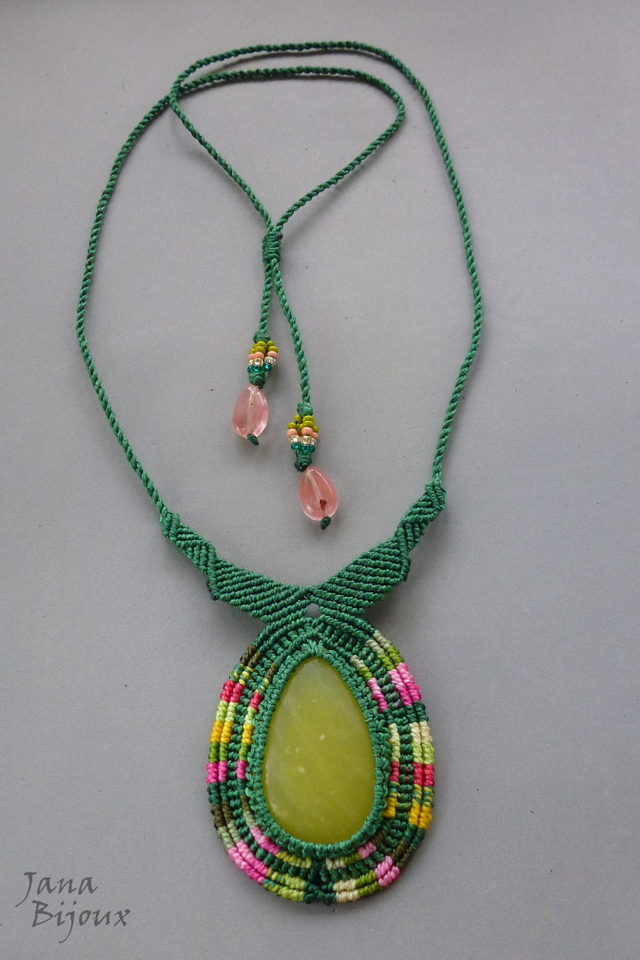 Comprimento ajustável, com caimento perfeito, abre até 84 cm, nas pontas tem 2 camadas de miçangas nas cores do colar e 2 vidros verdes. O colar por ter macramé em cima da pedra um pouco mais fechado, melhor ser usado como médio ou comprido (= não muito colado no pescoço) , caimento perfeito, sem emendas. Nas laterias macramé em formato de 2 folhas. Cada ponta do colar tem um pouco outro comprimento, não é defeito nem descuido, é de propósito :-).