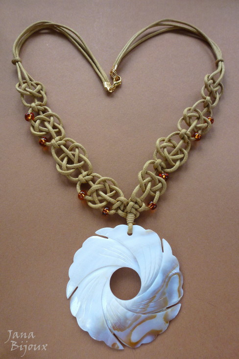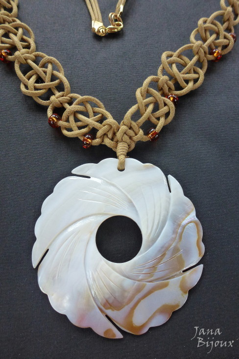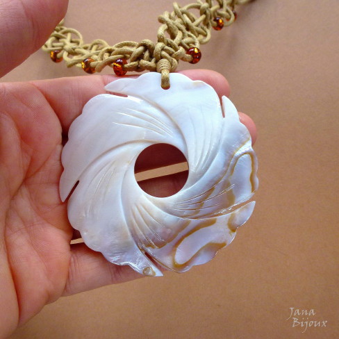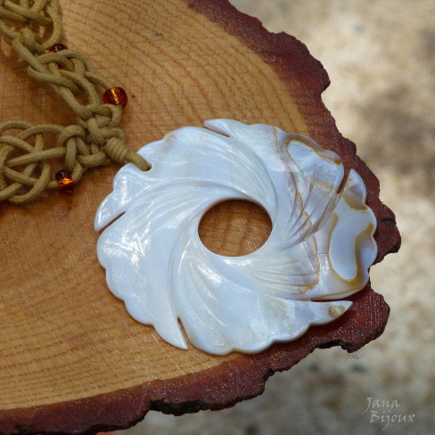 A margaritifera – é uma madrepérola de água doce, esta é de Indonésia e tem brilho aveludado e furta-cor. O formado dela meia lua mede 8 cm por 5 cm. Em volta tem macramé que segura-a só pelos nós, sem cola, sem furo. 25 cristais fosco na cor rosa antigo.