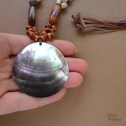 A margaritifera – é uma madrepérola de água doce, esta é de Indonésia e tem brilho aveludado e furta-cor. O formado dela meia lua mede 8 cm por 5 cm. Em volta tem macramé que segura-a só pelos nós, sem cola, sem furo. 25 cristais fosco na cor rosa antigo.