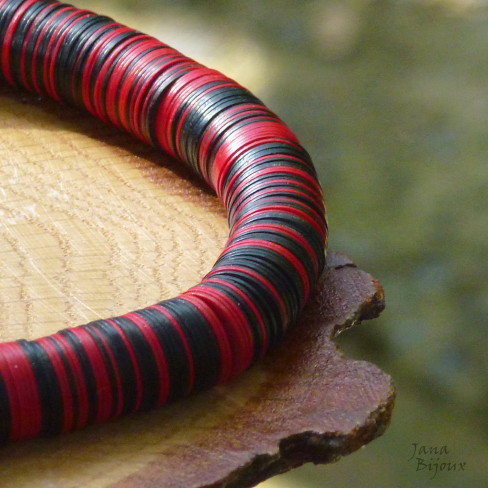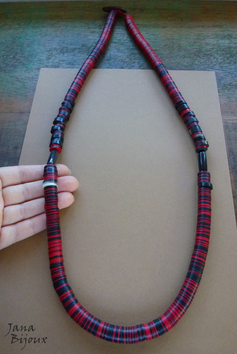 Colar maravilhoso, comprido 88 cm, todo feito com vinil africano grosso, guapuruvu e peças de chifres (uma delas com mecha branca de propósito, para quebrar o padrão de vermelho e preto muito clássico), mas as outras peças de chifre são todas pretas. O colar abre e fecha e é sem metal nenhum.De R$ 95,00 por R$ 75,00.