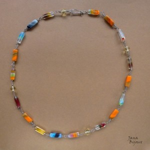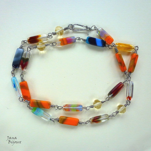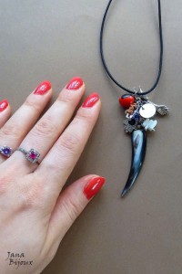 Jemný, dlouhý a velmi lehký náhrdelník se zubem z rohoviny, mix přívěšků a černé vosk. dovozové (USA) nitě a upravitelnou délkou.
