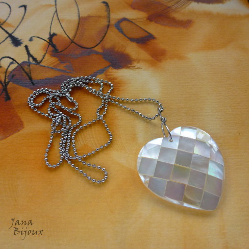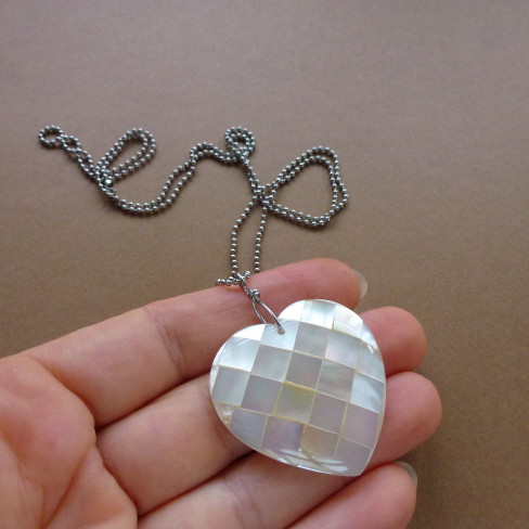 Colar sem fecho com corrente de bolinhas de inox, comprimento 60 cm e coração luxuoso de madrepérola (frente e trás) 3,7 cm por 4,5 cm. R$ 32,00