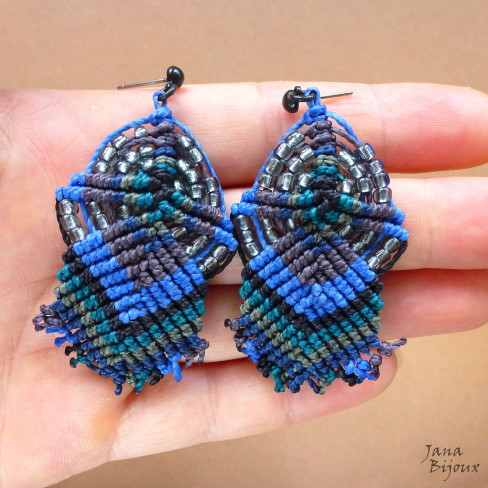 Brincos chiques, 6 cm longos e 2,6 cm largos, com micromacramé, cores saturadas e fecho dourado com tarraxa. Cores tons azuis, beringela, preto, verde esmeralda e burgundy. Mix de miçangas metálicas, transparente e cintilantes R$ 29,90.