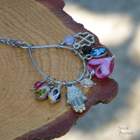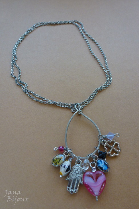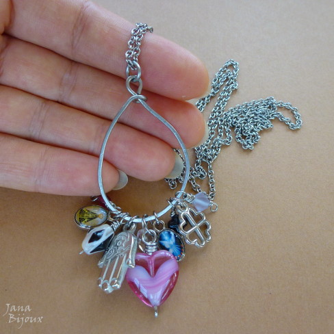 Colar comprido artesanal de aço inox. Pingente 8 cm de aço forjado, com vidro e pequenos pingentes de espírito santo, nossa senhora Aparecida e trevo todos dupla-face, pingente de mão hamsa, millefiori, coração de vidro. Corrente sem fecho tem 76 cm R$ 26,00.